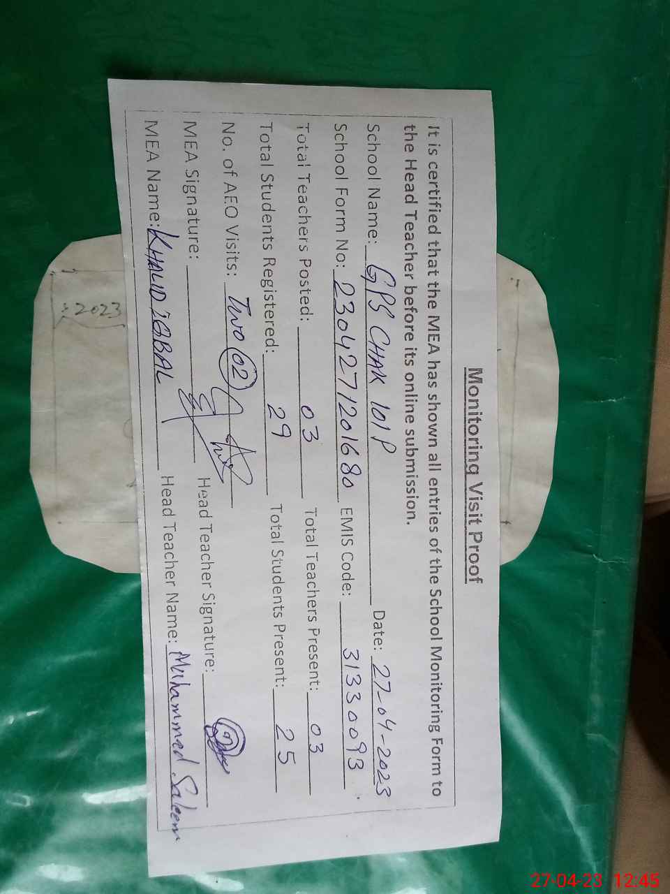 | Attendance Register | Head Teacher | MEA with School | Visit Proof |