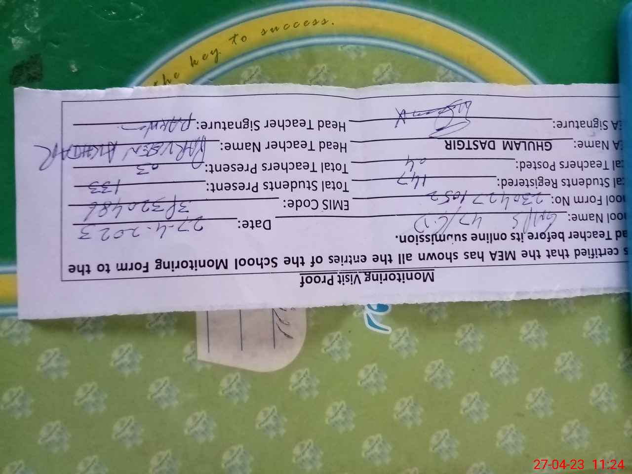 | Attendance Register | Head Teacher | MEA with School | Visit Proof |
