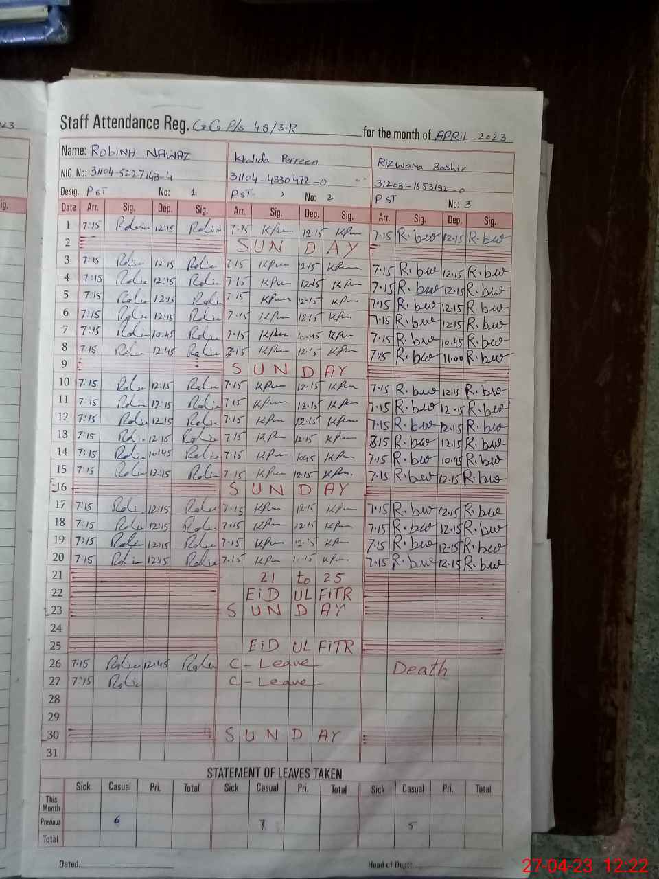 | CNIC | Full Name | Designation | R/C | Absence During Last Calender Month |