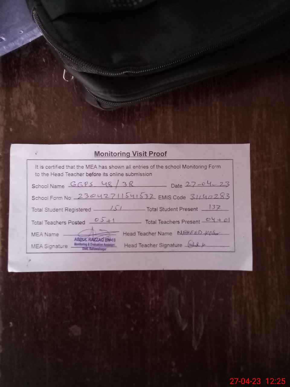 | Attendance Register | Head Teacher | MEA with School | Visit Proof |