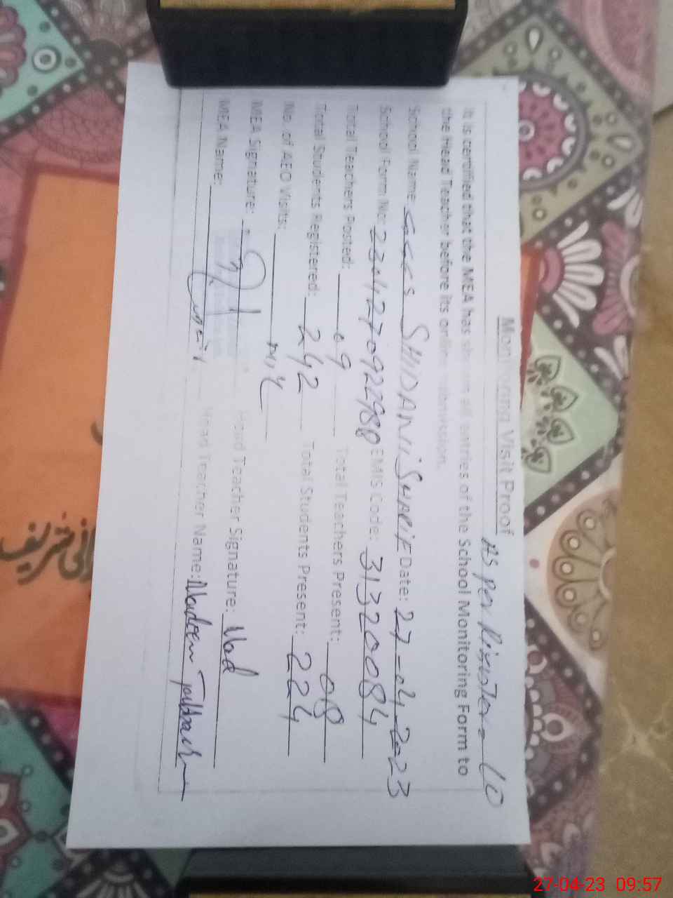 | Attendance Register | Head Teacher | MEA with School | Visit Proof |