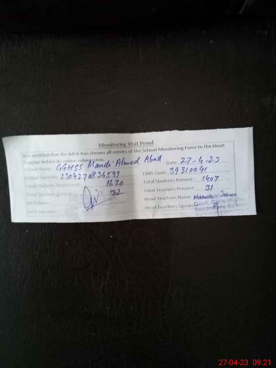 | EMIS Code: 39310041 | Name of School: GGHSS MANDI AHMED ABAD | |||
