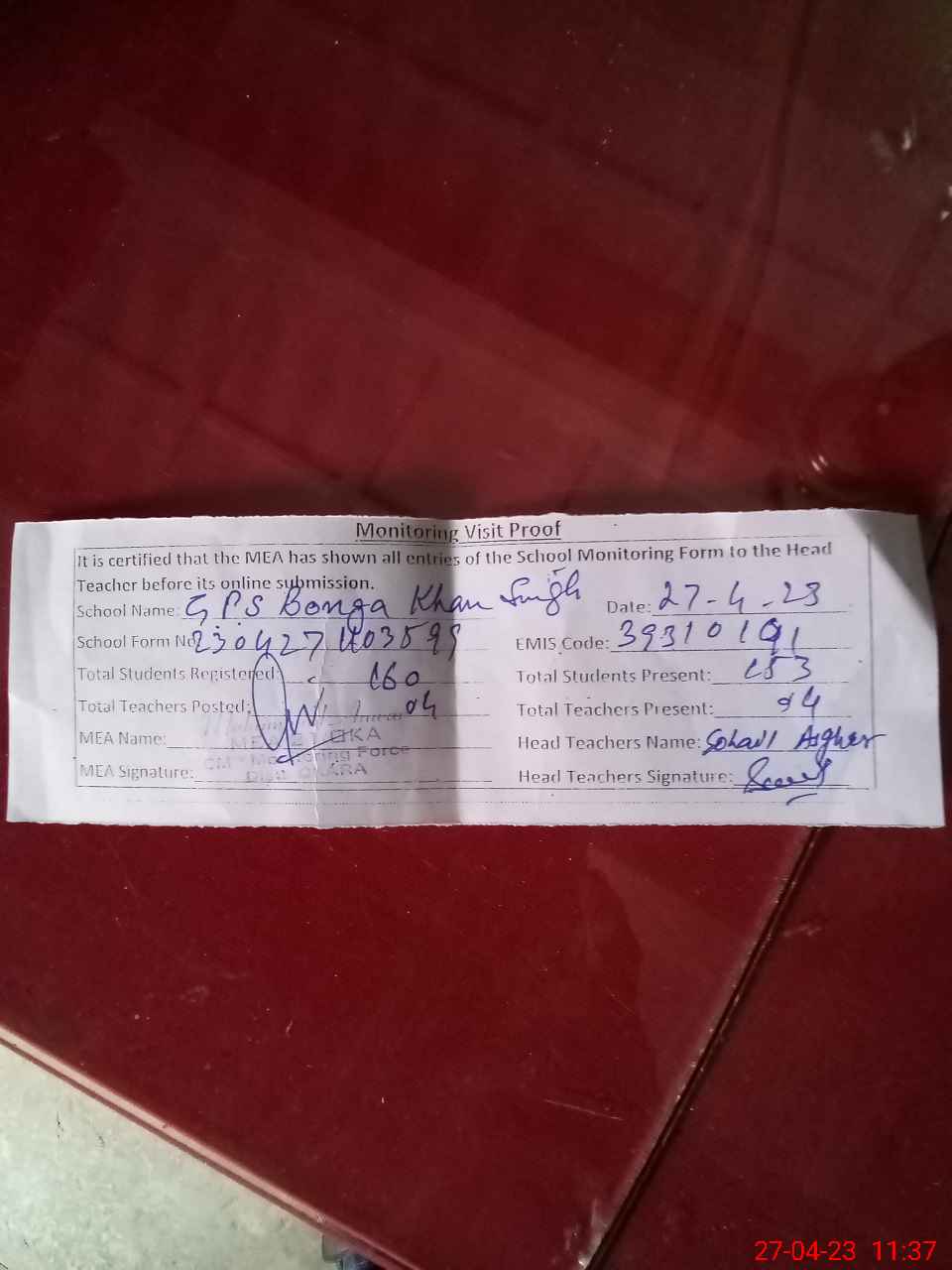 | EMIS Code: 39310191 | Name of School: GPS BUNGA KHAN SINGH | |||