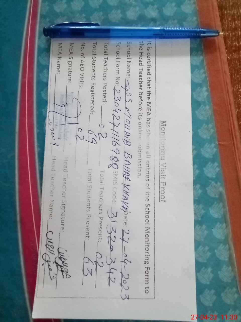 | Attendance Register | Head Teacher | MEA with School | Visit Proof |