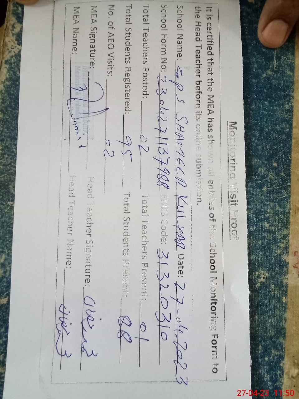 | Attendance Register | Head Teacher | MEA with School | Visit Proof |
