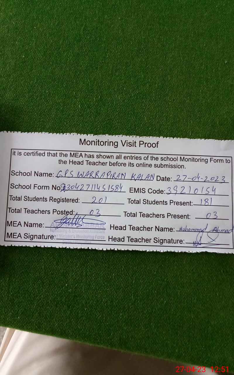 | EMIS Code: 39210154 | Name of School: GPS WARRA PIRAN KALAN | |||
