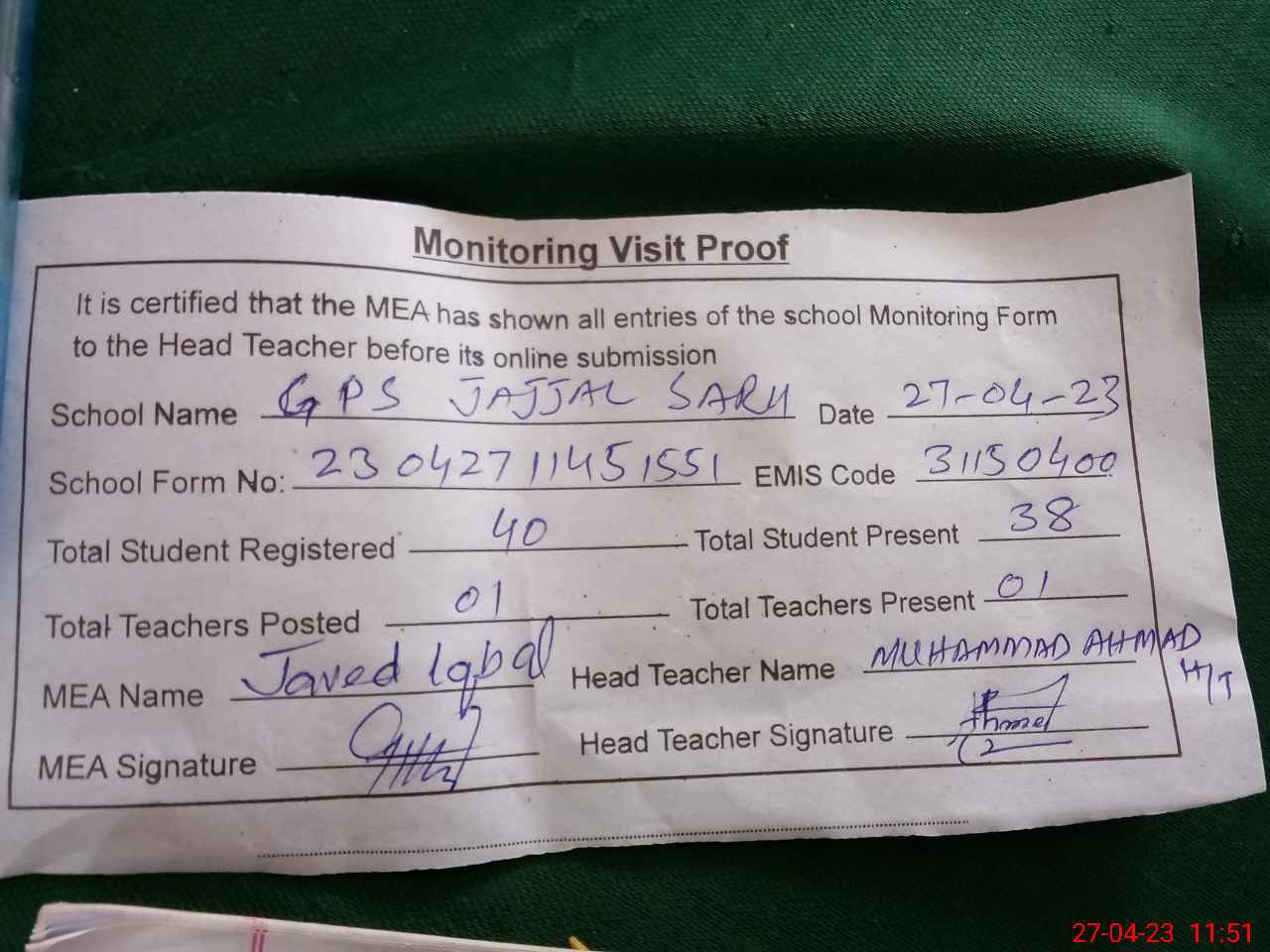 | Attendance Register | Head Teacher | MEA with School | Visit Proof |