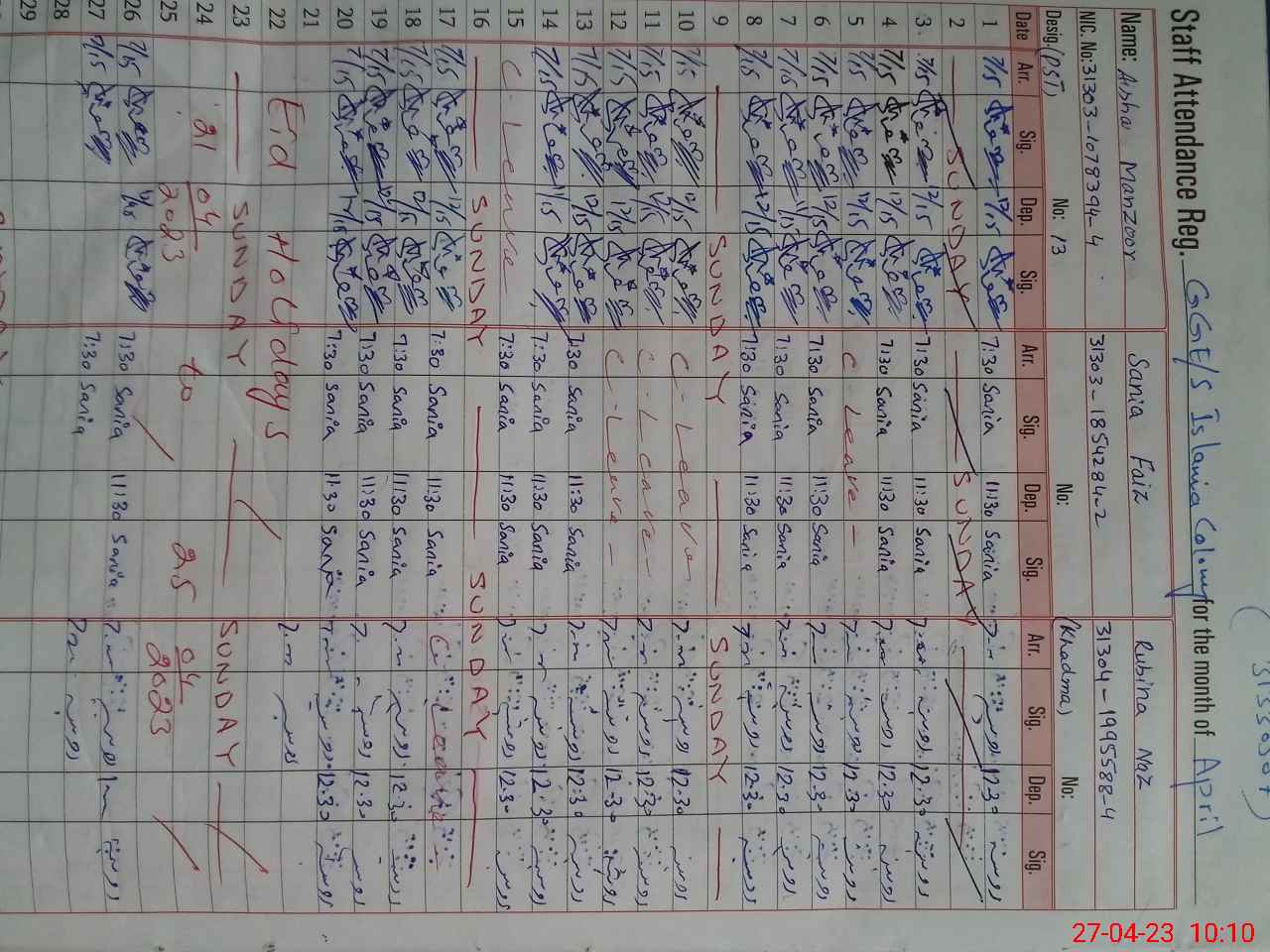 | CNIC | Full Name | Designation | R/C | Absence During Last Calender Month |