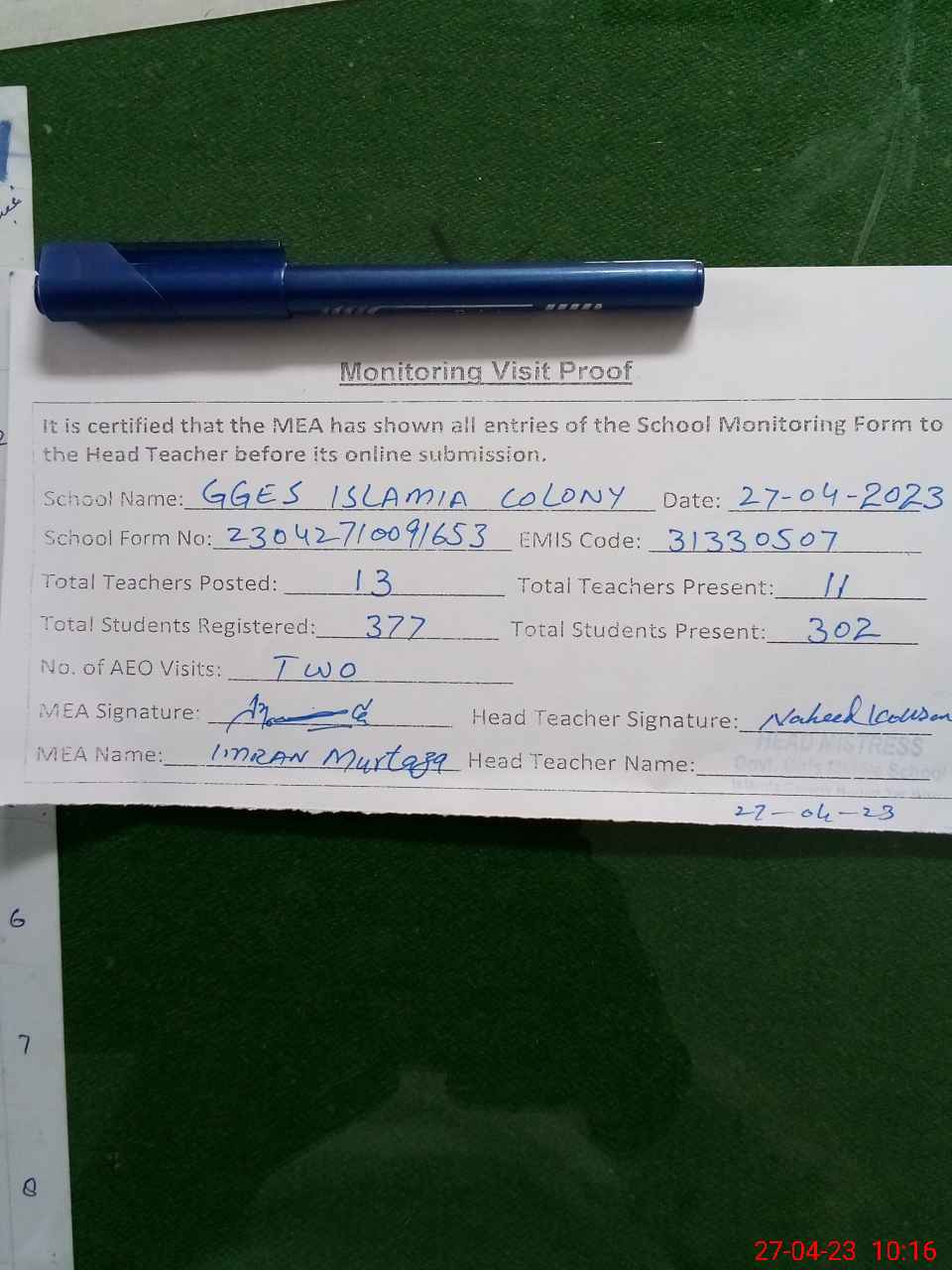 | Attendance Register | Head Teacher | MEA with School | Visit Proof |