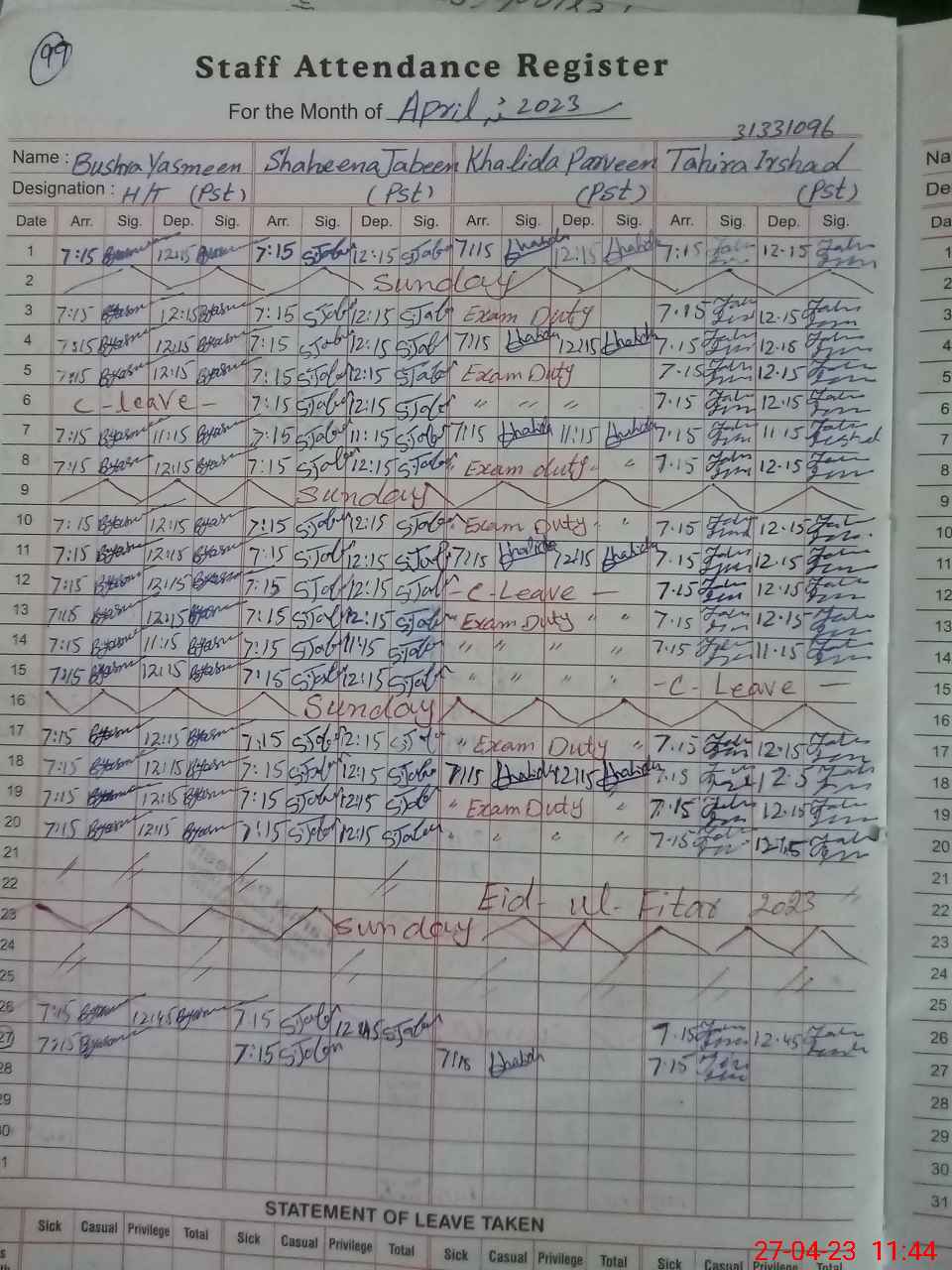 | Leave | Duty | Absent | Maternity | Medical | Ex- Pak |
