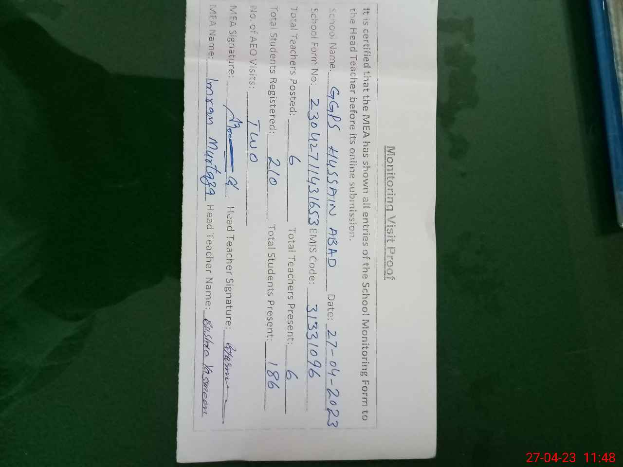 | Attendance Register | Head Teacher | MEA with School | Visit Proof |