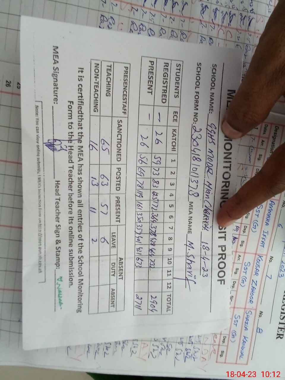 | Attendance Register | Head Teacher | MEA with School | Visit Proof |