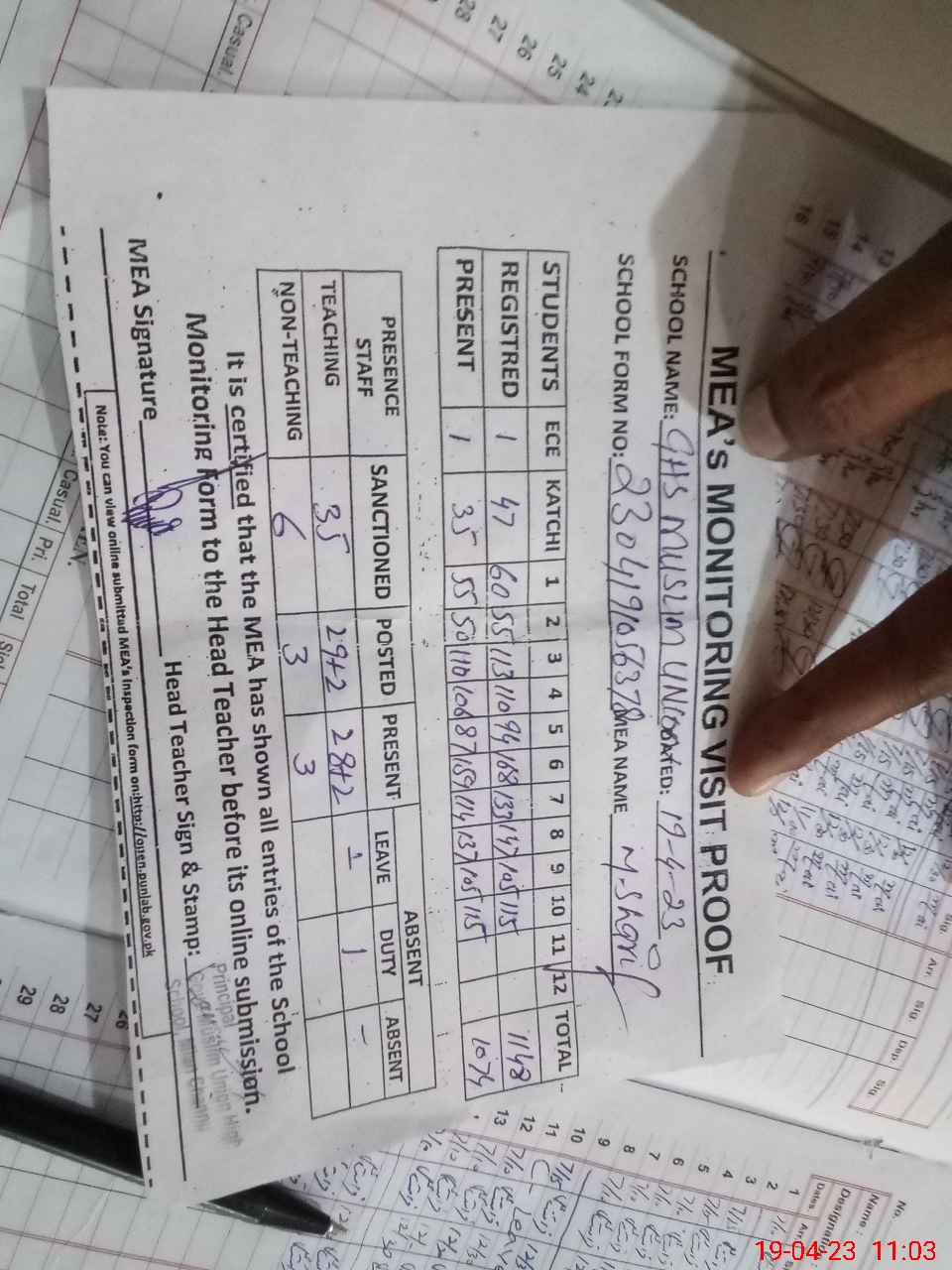 | Attendance Register | Head Teacher | MEA with School | Visit Proof |