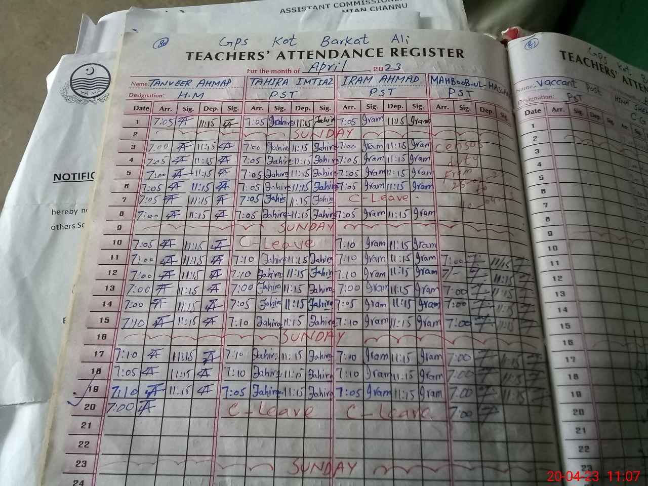 | CNIC | Full Name | Designation | R/C | Absence During Last Calender Month |