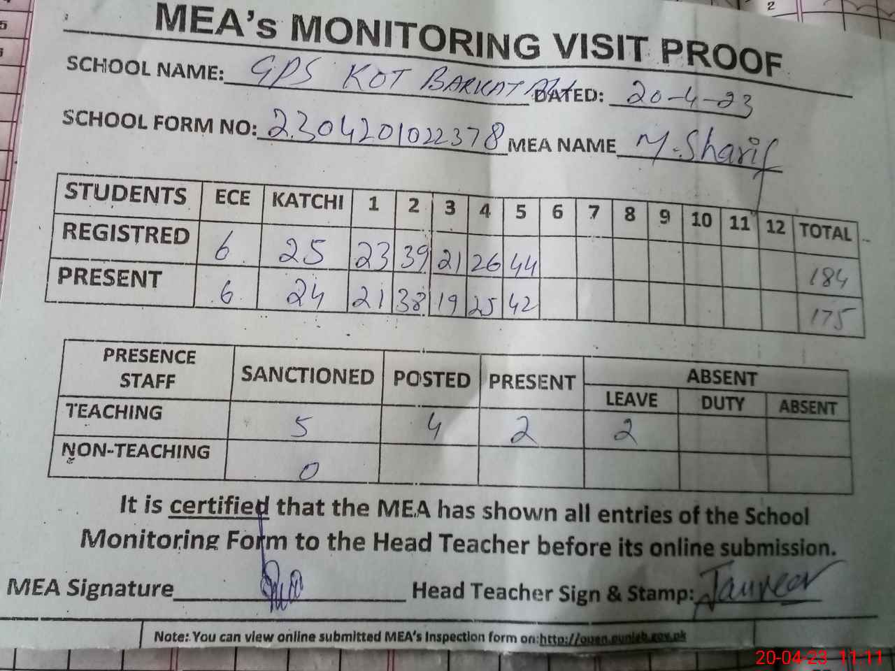 | Attendance Register | Head Teacher | MEA with School | Visit Proof |