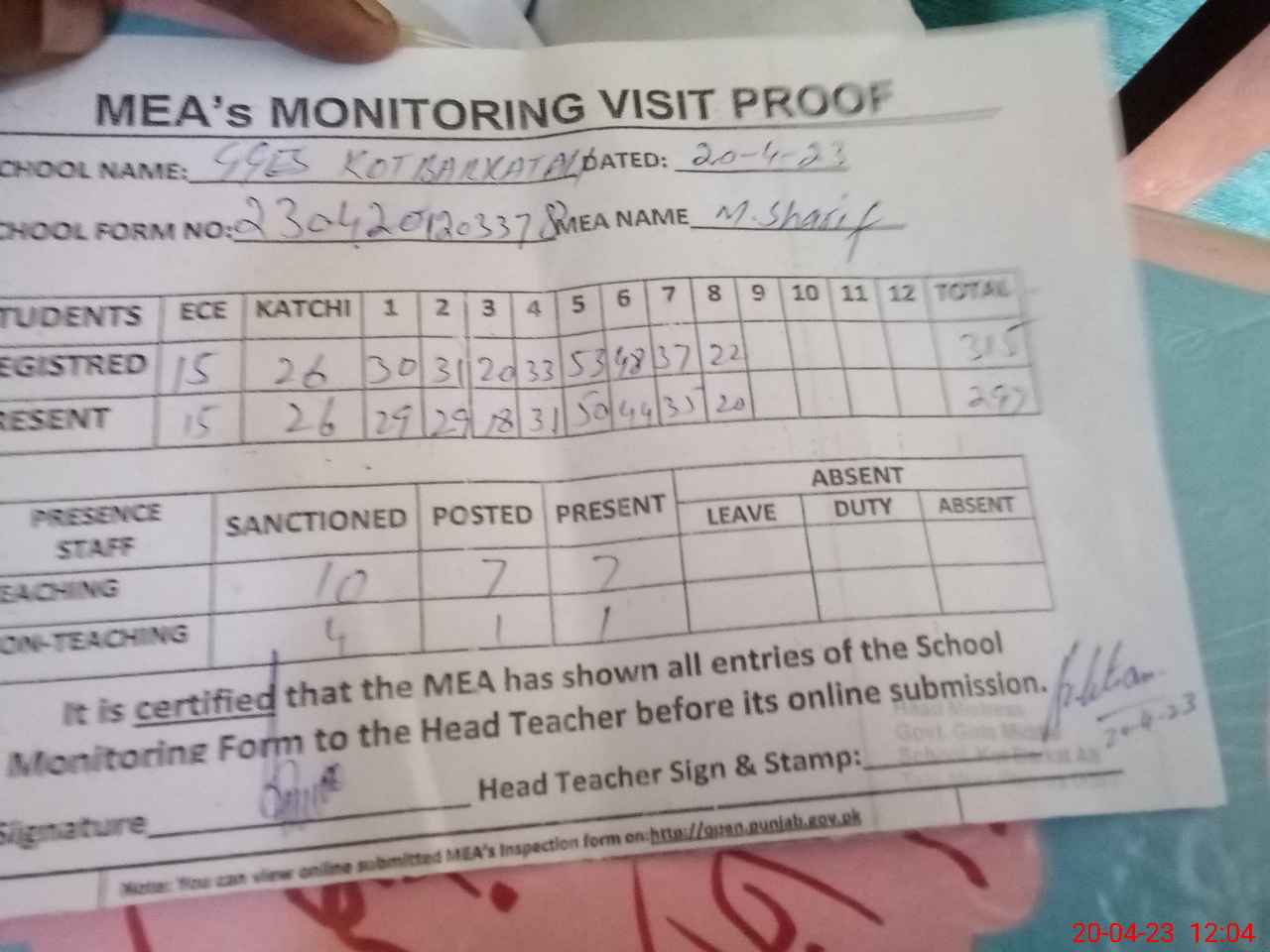 | Attendance Register | Head Teacher | MEA with School | Visit Proof |