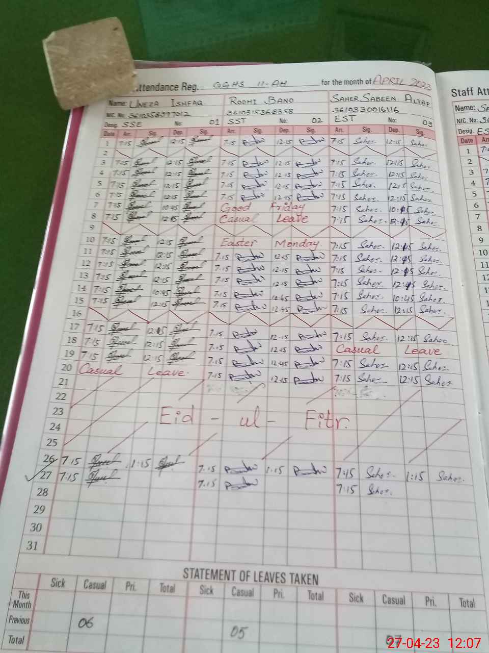 | CNIC | Full Name | Designation | R/C | Absence During Last Calender Month |