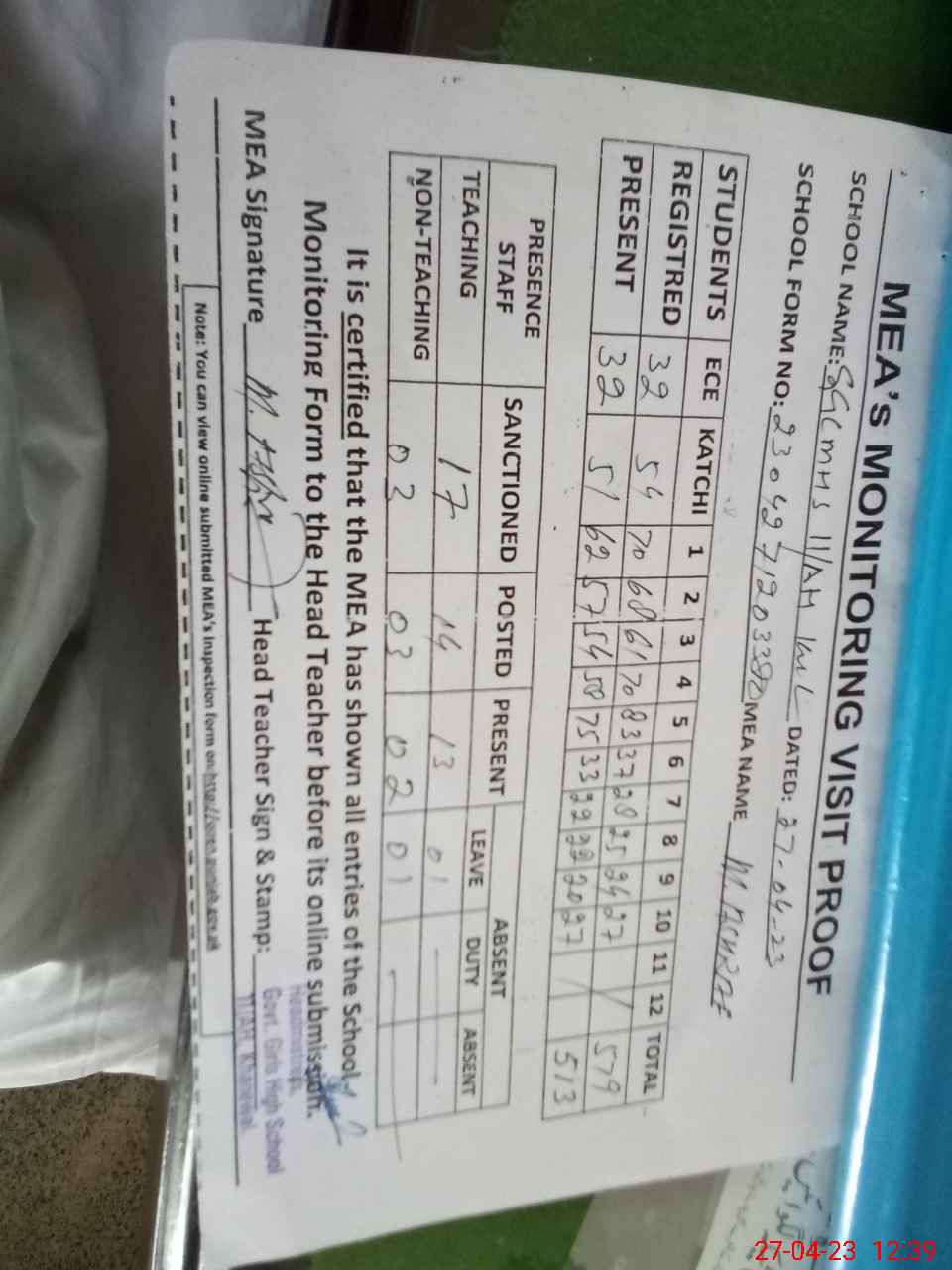 | Attendance Register | Head Teacher | MEA with School | Visit Proof |