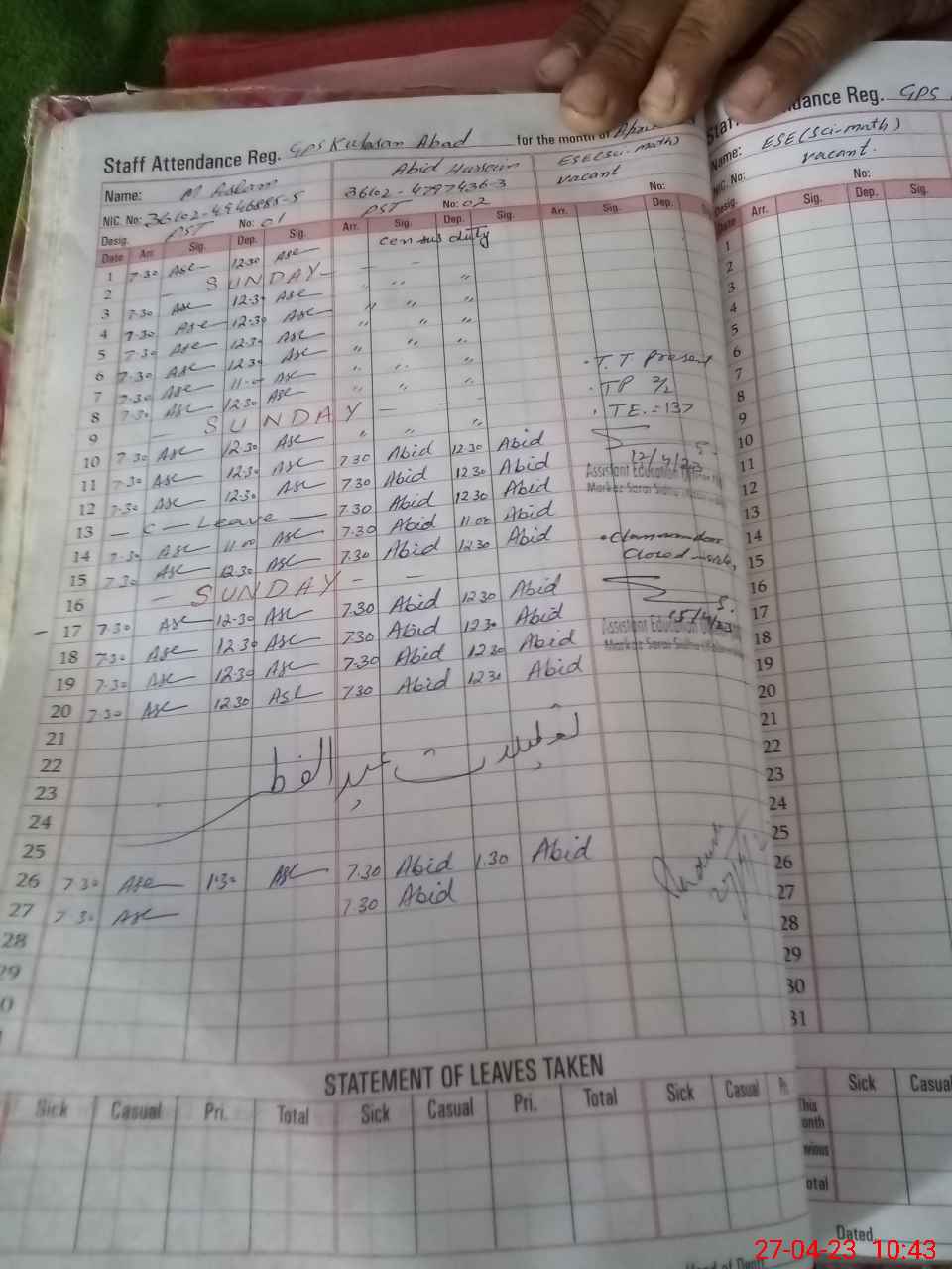 | CNIC | Full Name | Designation | R/C | Absence During Last Calender Month |