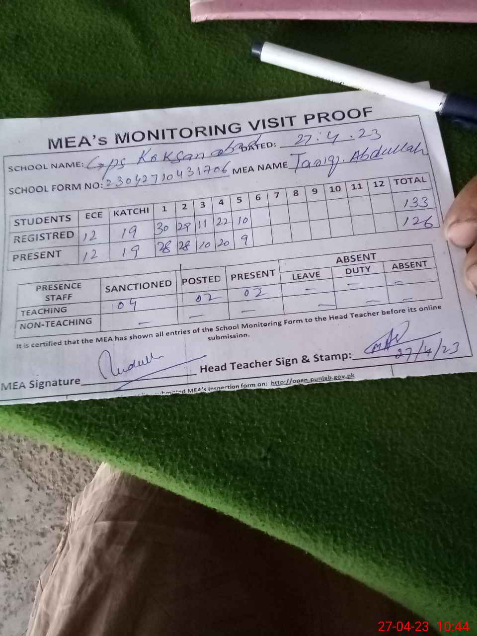 | Attendance Register | Head Teacher | MEA with School | Visit Proof |