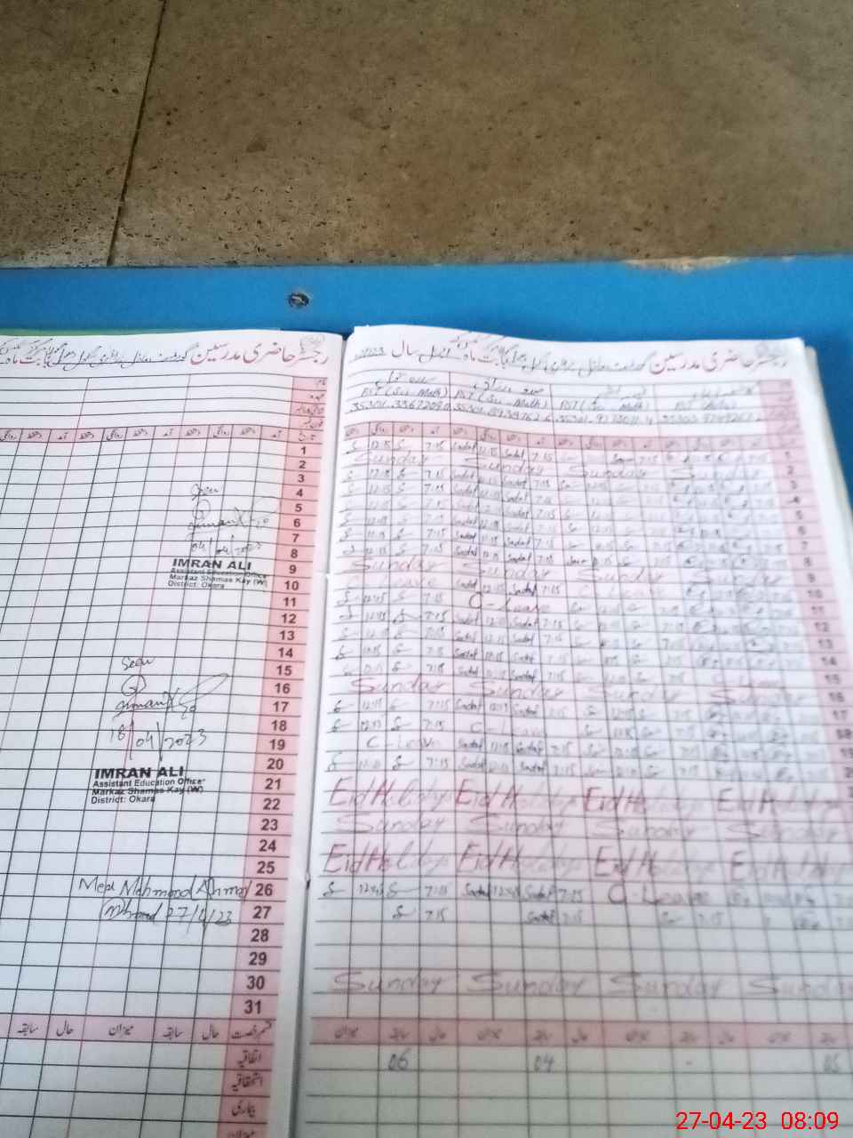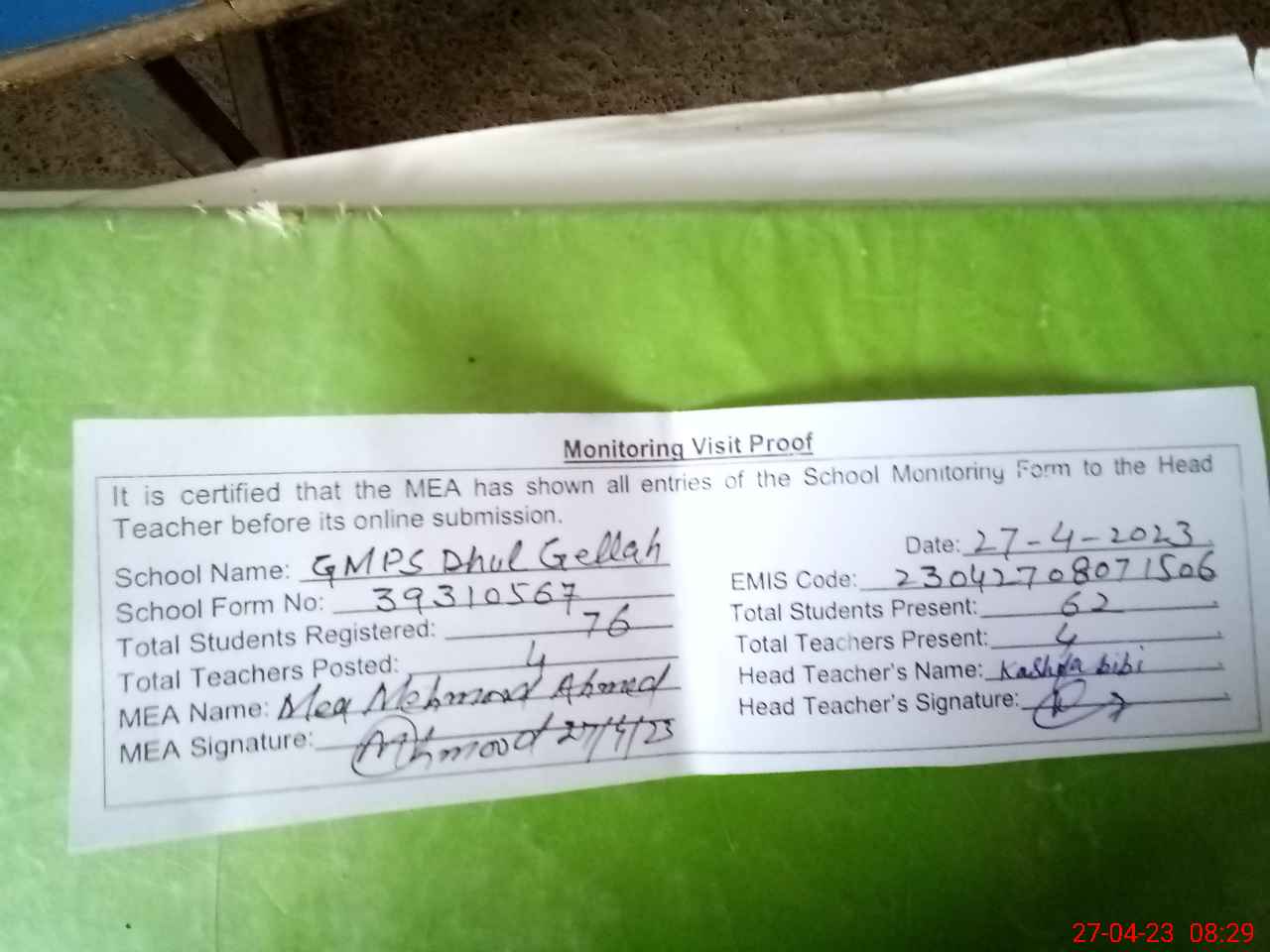 | Attendance Register | Head Teacher | MEA with School | Visit Proof |