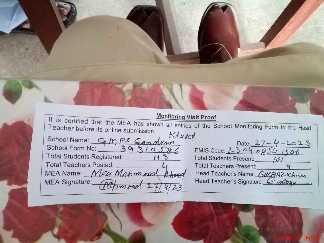 | Attendance Register | Head Teacher | MEA with School | Visit Proof |