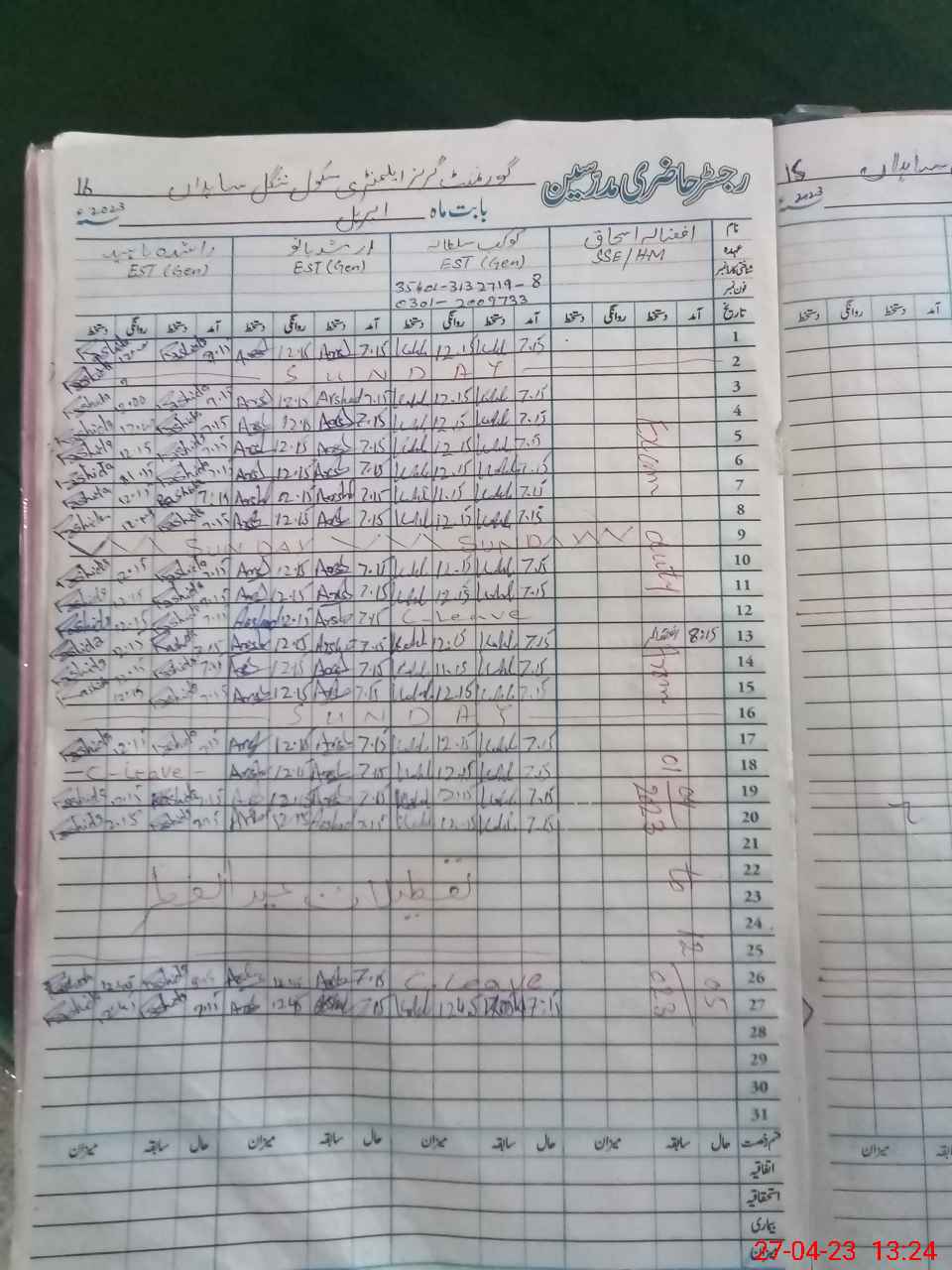 | CNIC | Full Name | Designation | R/C | Absence During Last Calender Month |