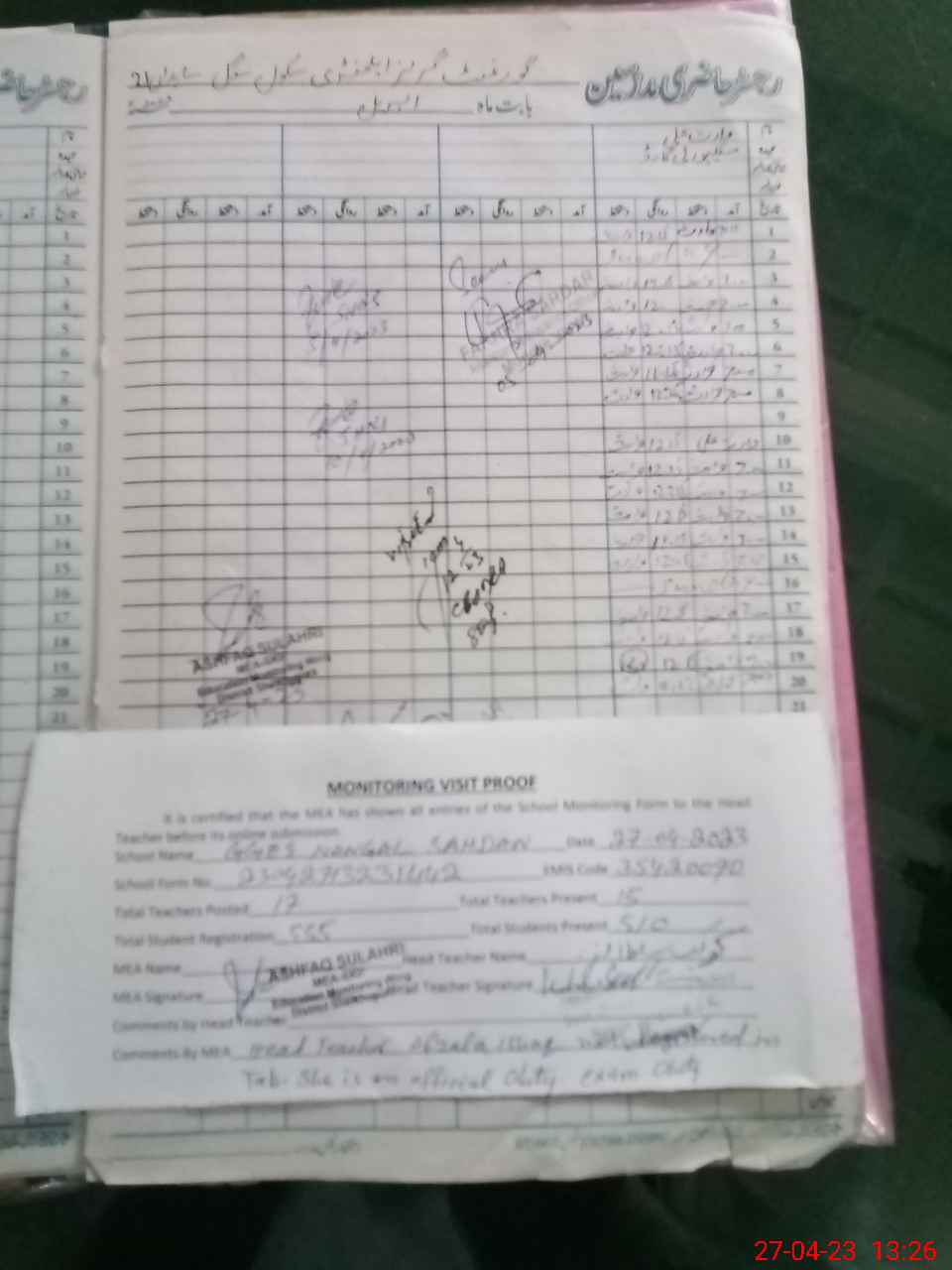 | Attendance Register | Head Teacher | MEA with School | Visit Proof |