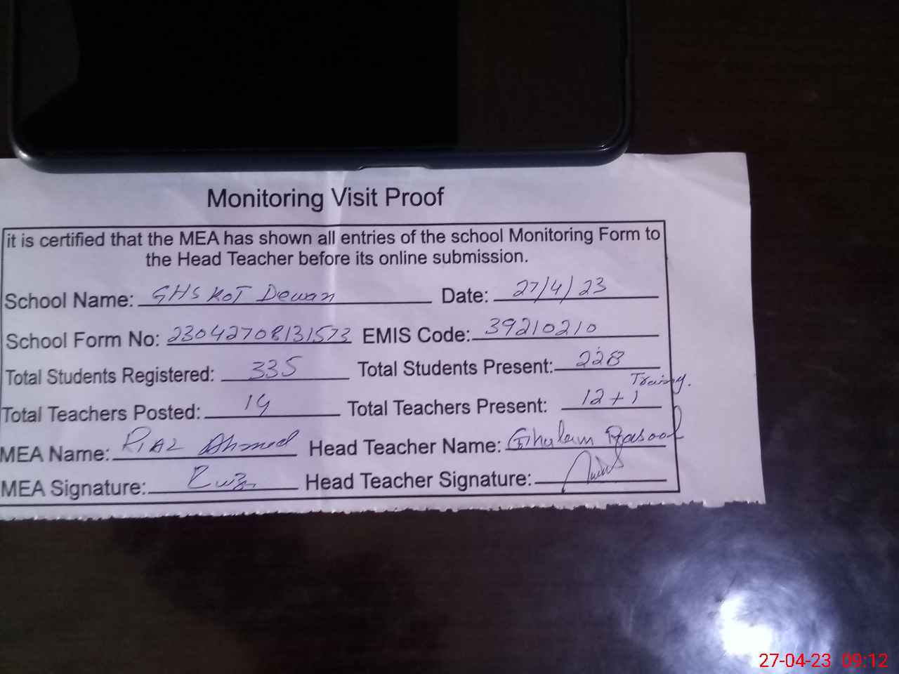 | Attendance Register | Head Teacher | MEA with School | Visit Proof |
