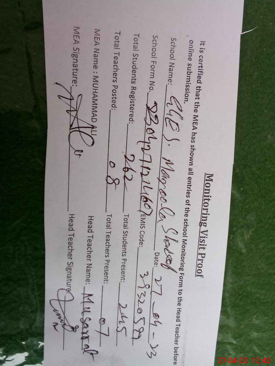 | Attendance Register | Head Teacher | MEA with School | Visit Proof |