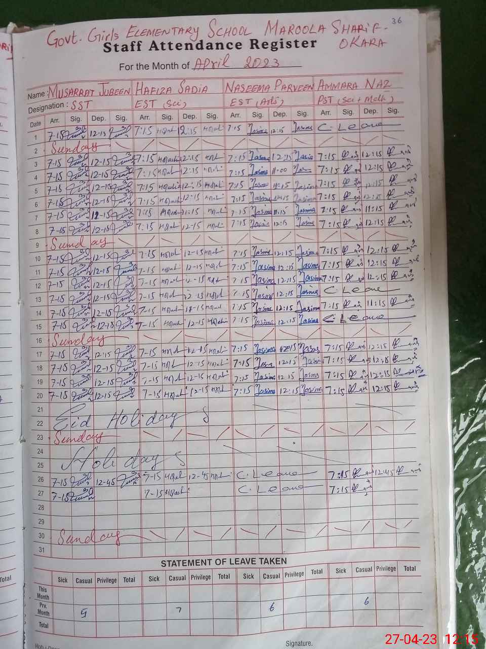 | CNIC | Full Name | Designation | R/C | Absence During Last Calender Month |