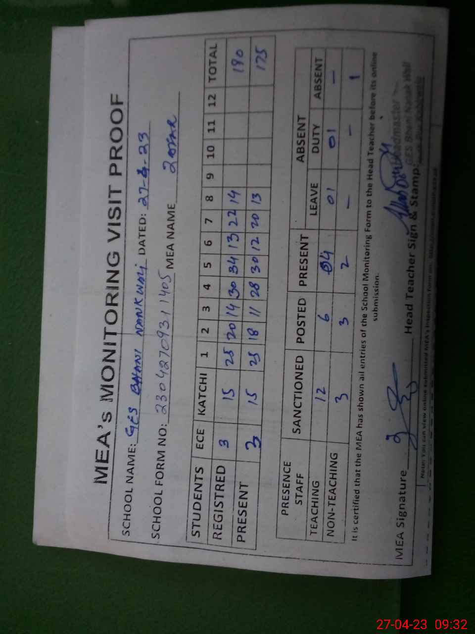 | Attendance Register | Head Teacher | MEA with School | Visit Proof |