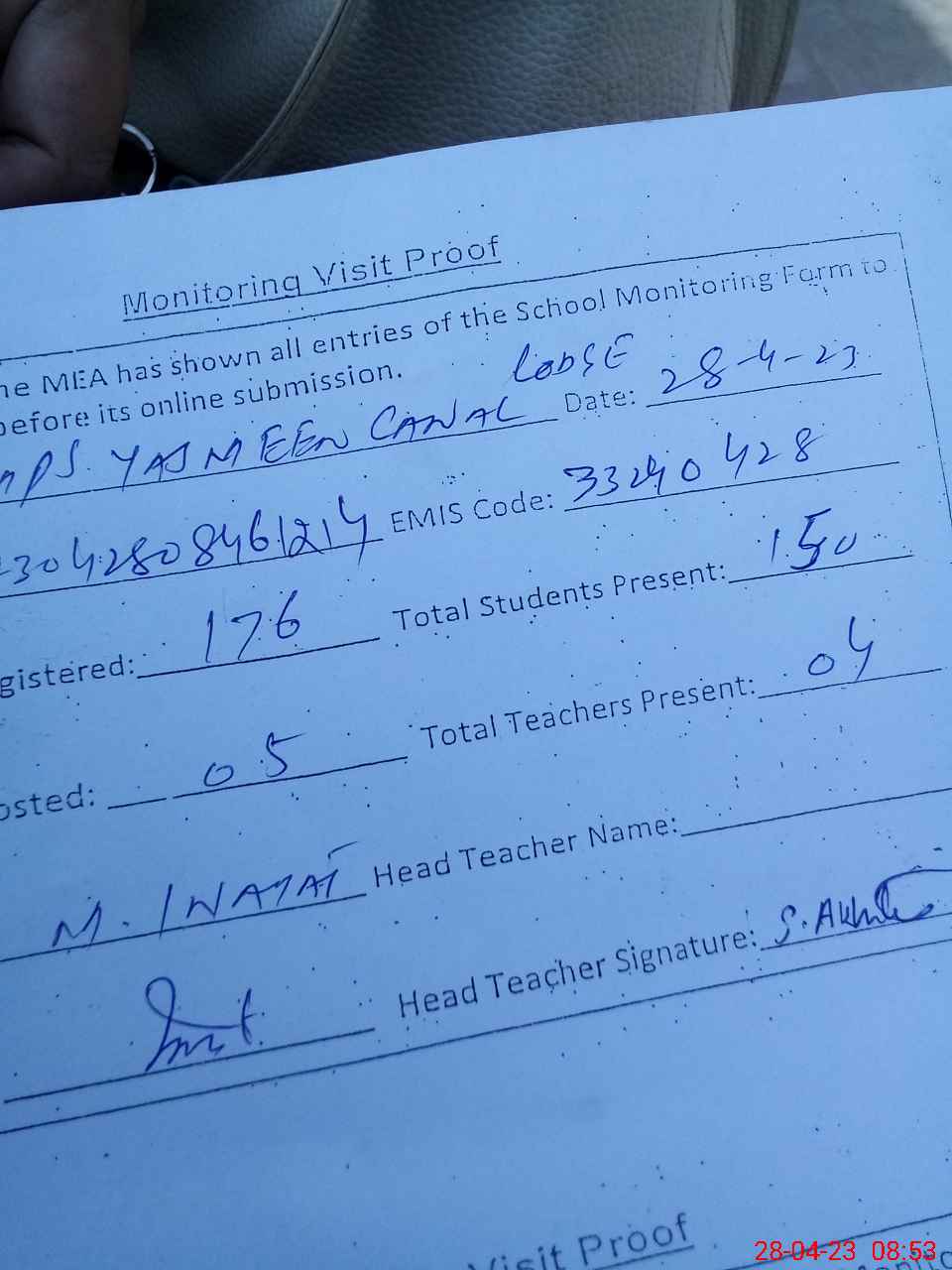| Attendance Register | Head Teacher | MEA with School | Visit Proof |