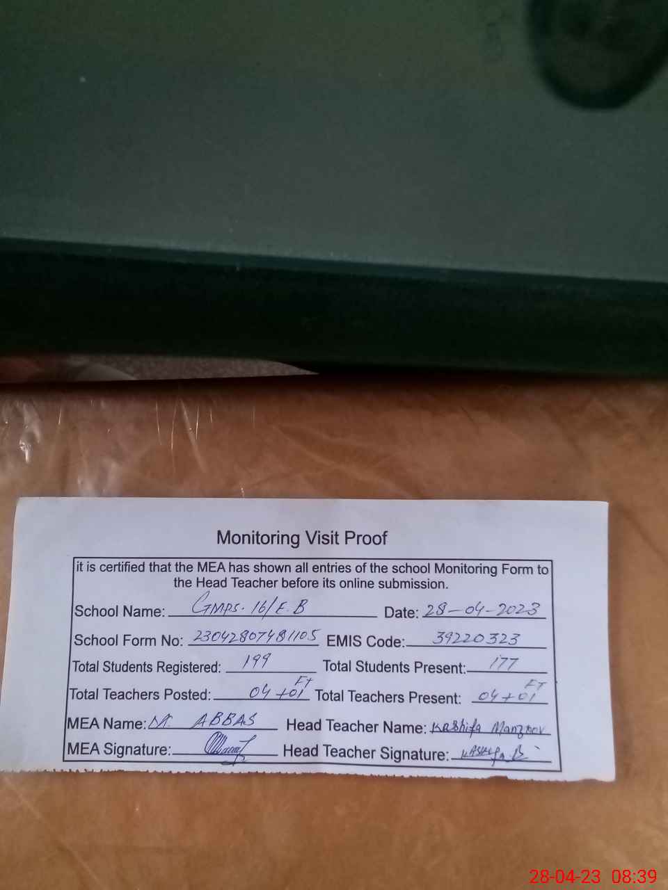 | Attendance Register | Head Teacher | MEA with School | Visit Proof |