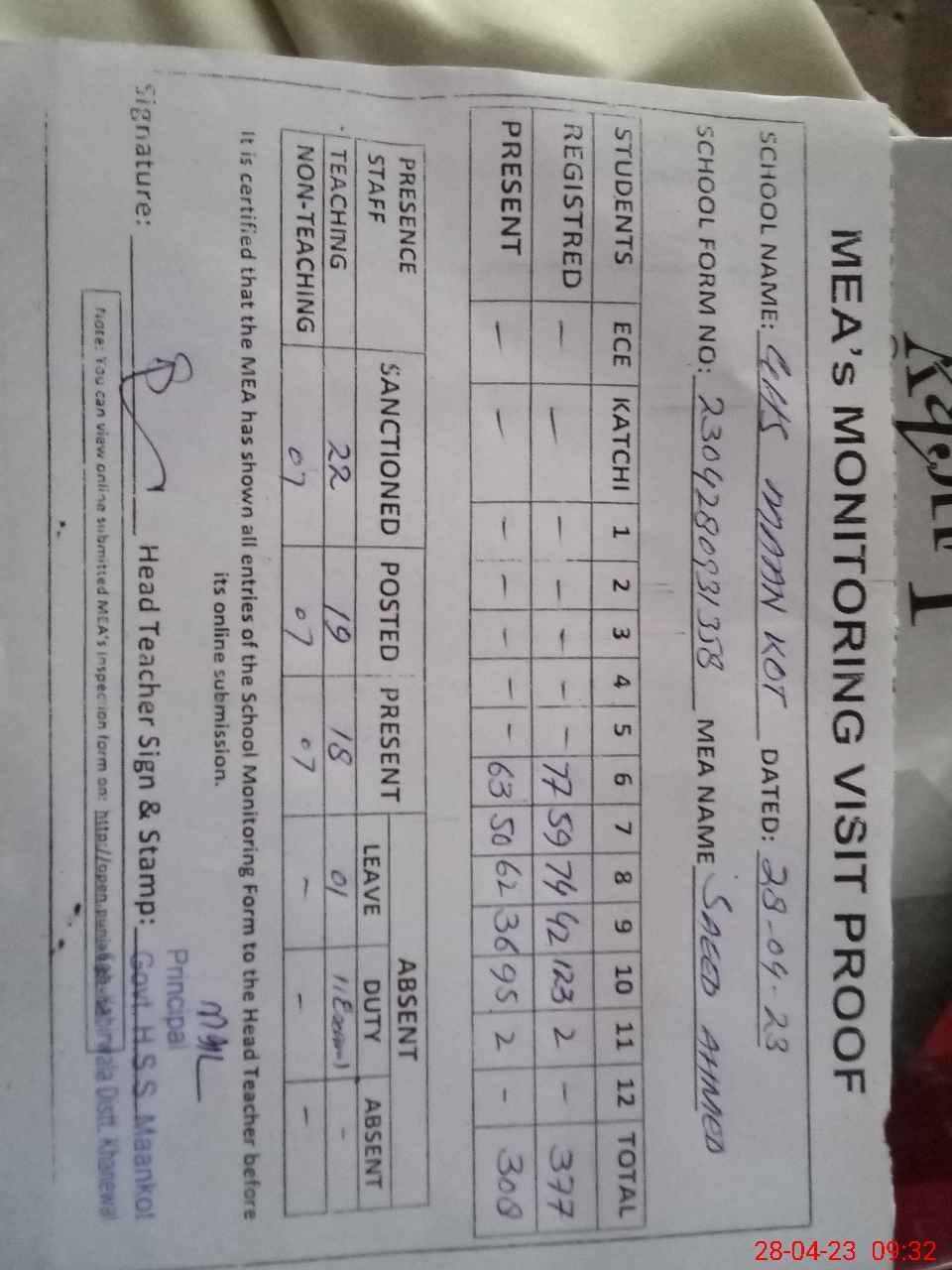 | Attendance Register | Head Teacher | MEA with School | Visit Proof |