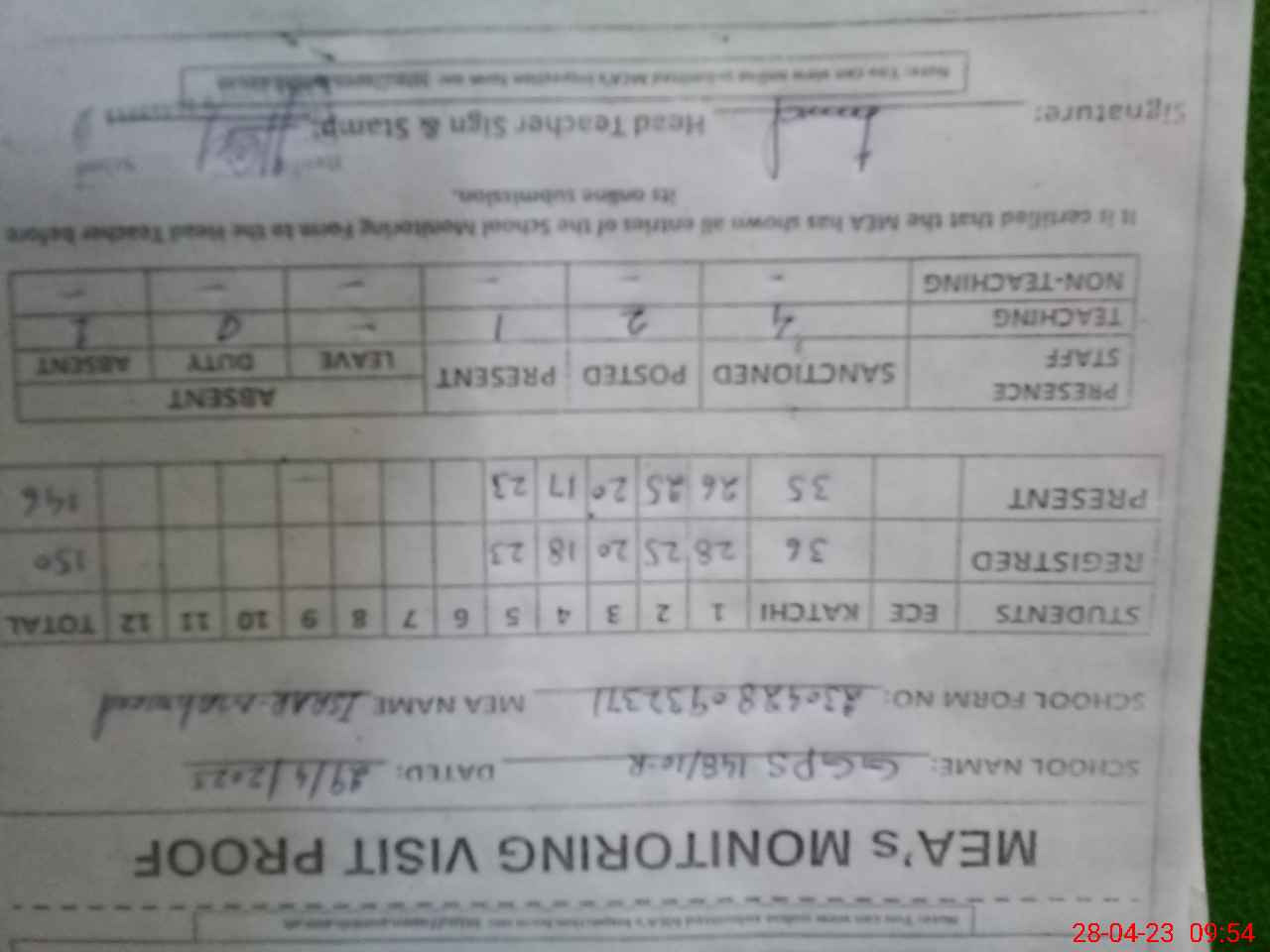 | Attendance Register | Head Teacher | MEA with School | Visit Proof |