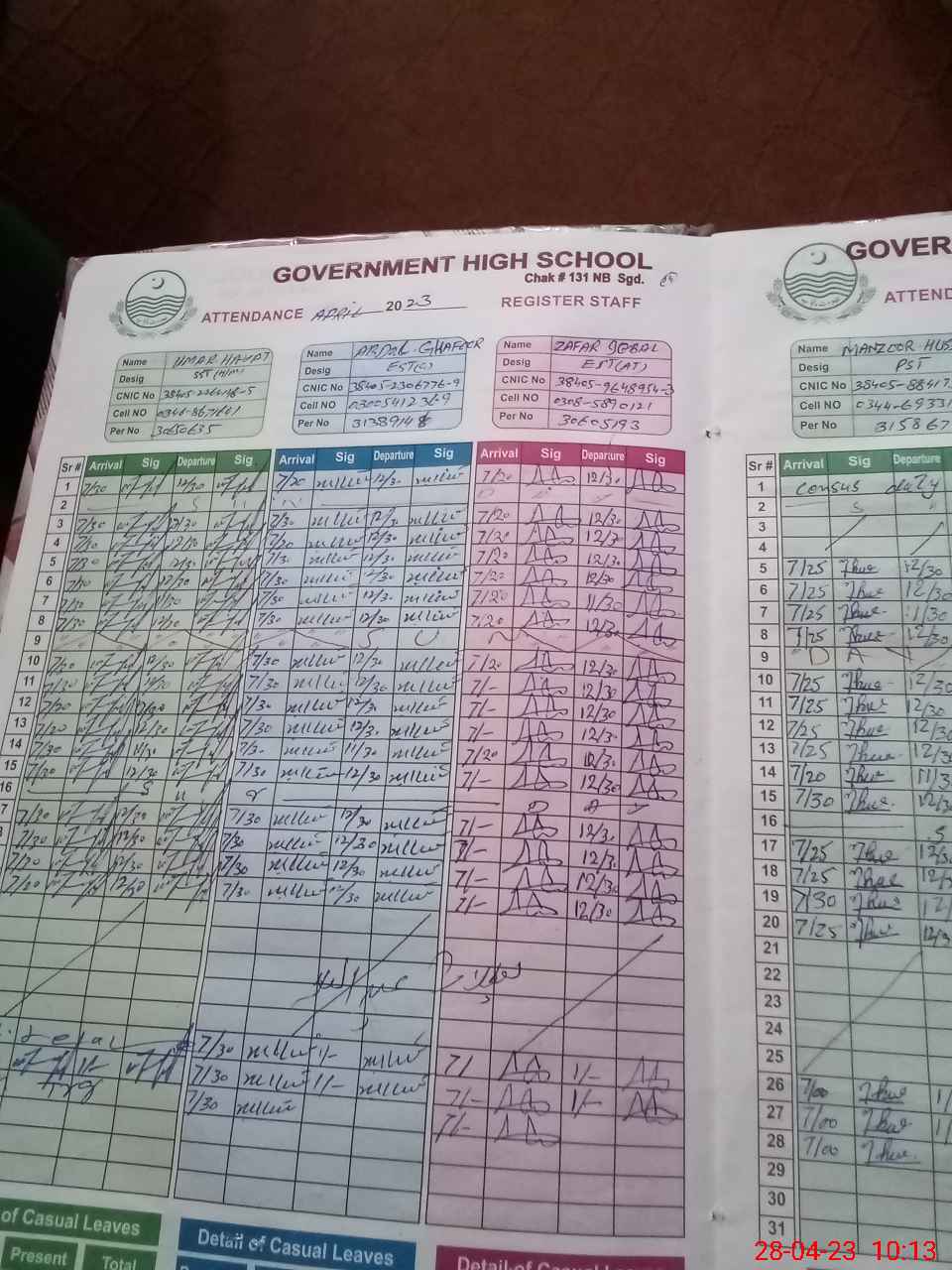 | CNIC | Full Name | Designation | R/C | Absence during last cal. month |