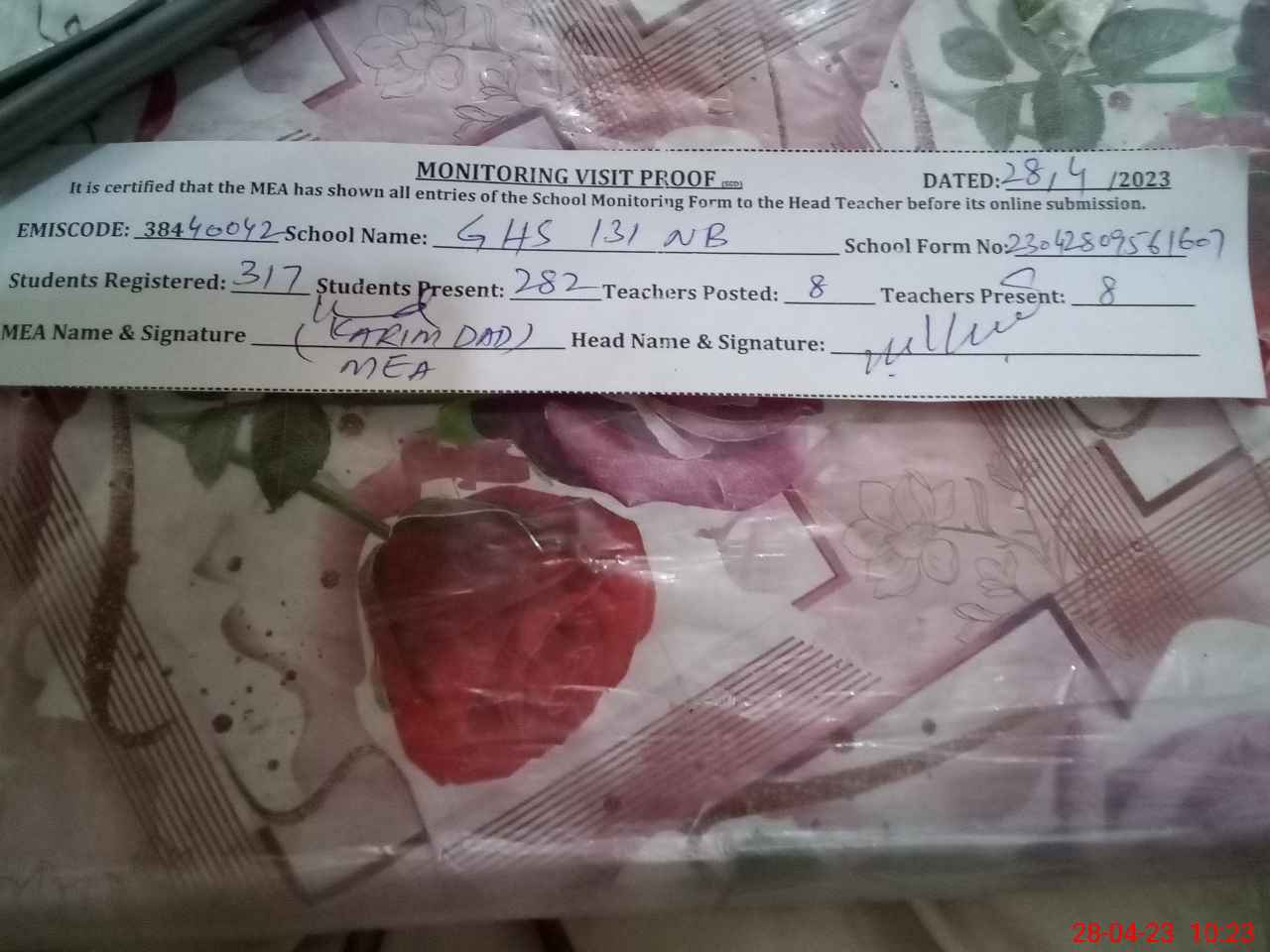 | Attendance Register | Head Teacher | MEA with School | Visit Proof |