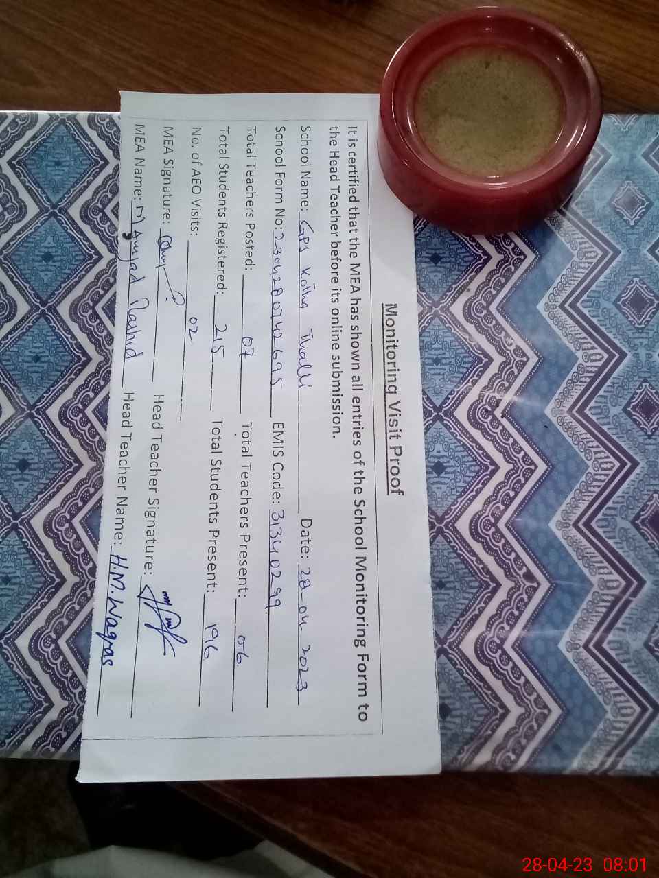 | Attendance Register | Head Teacher | MEA with School | Visit Proof |