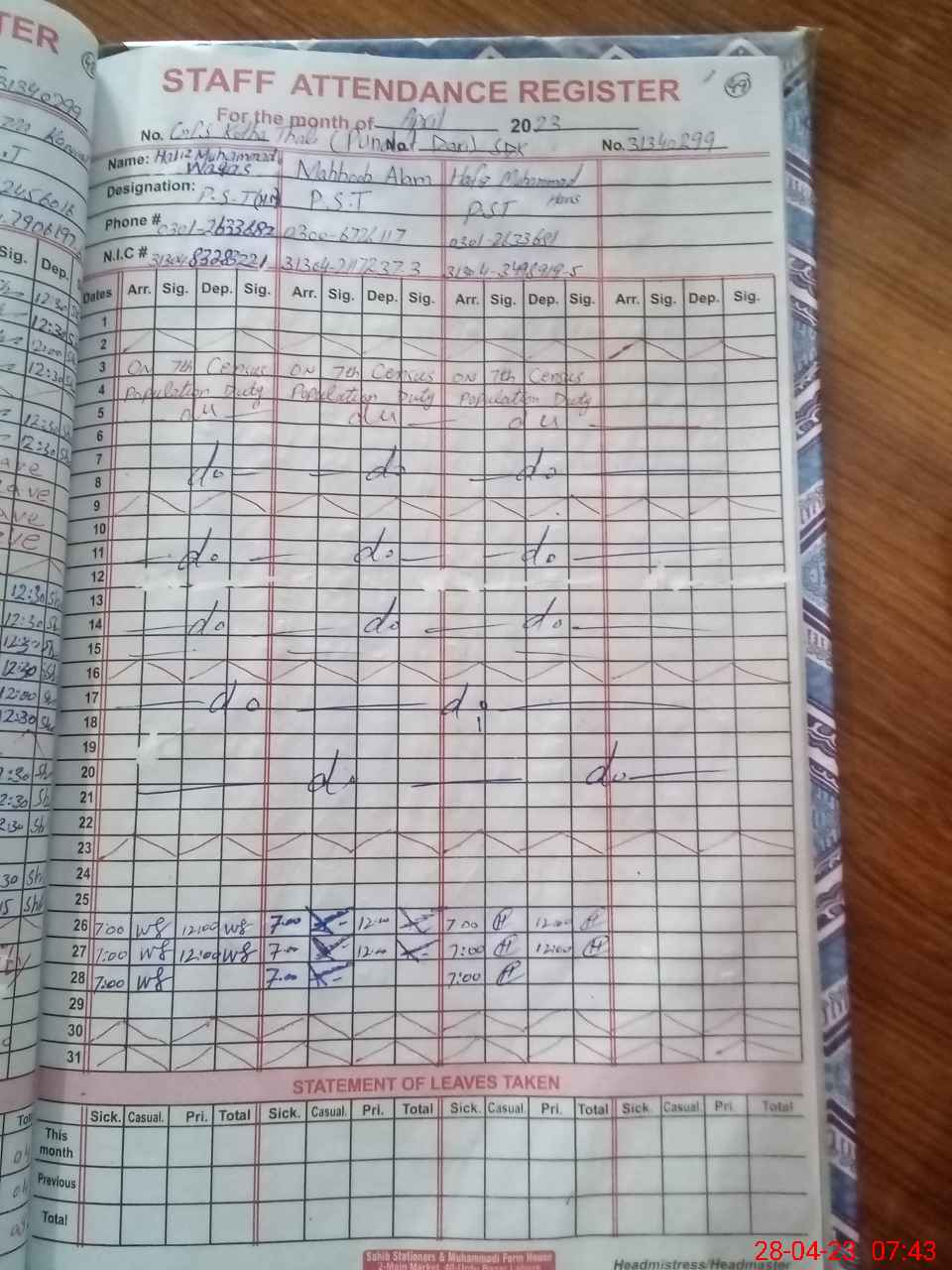 | CNIC | Full Name | Designation | R/C | Absence During Last Calender Month |