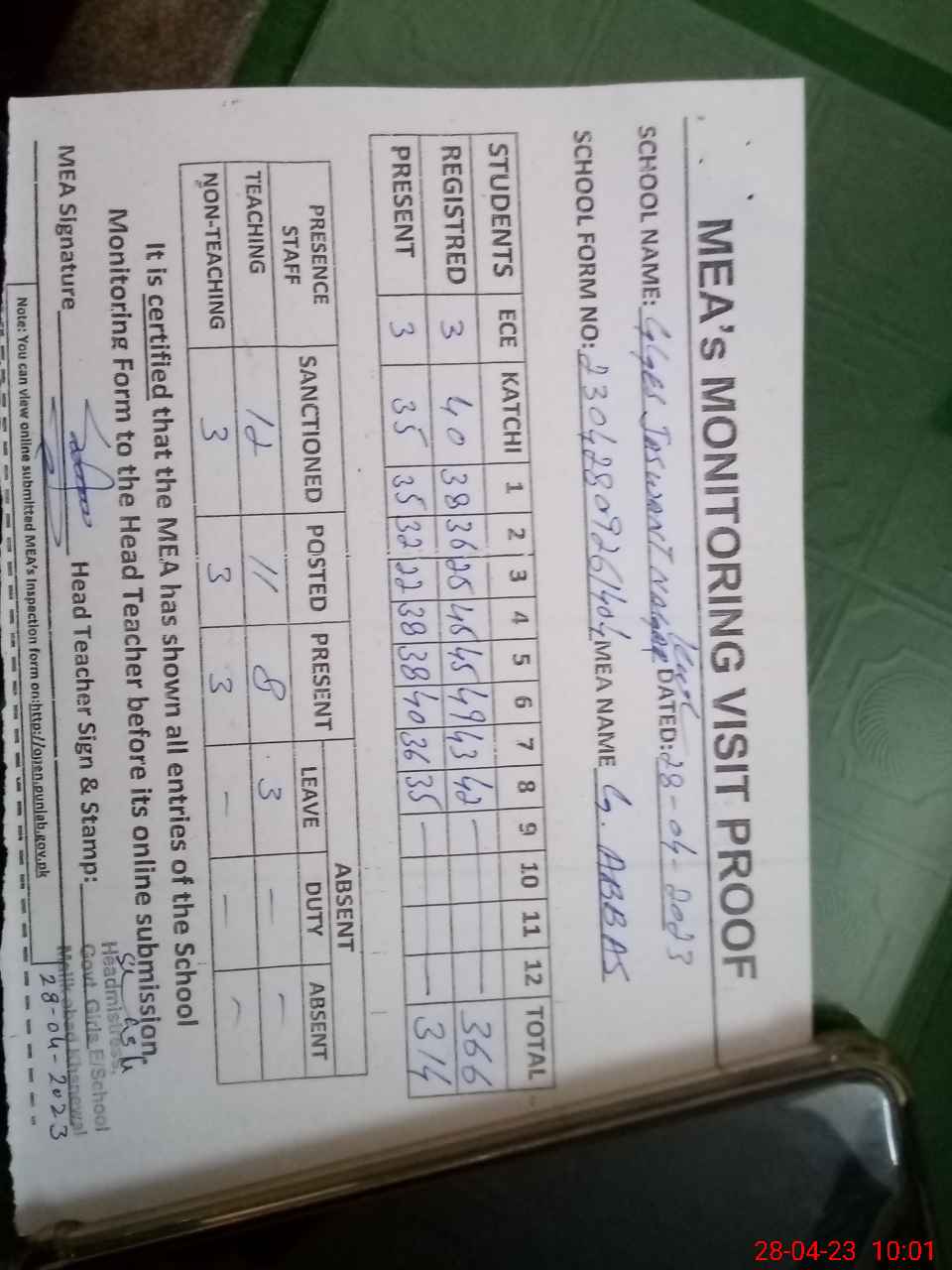 | Attendance Register | Head Teacher | MEA with School | Visit Proof |