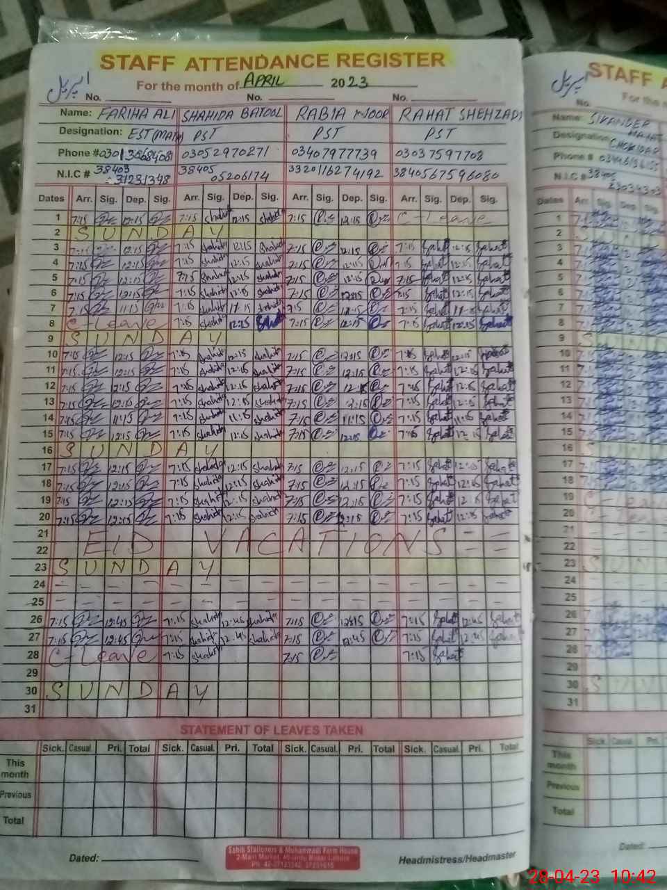 | CNIC | Full Name | Designation | R/C | Absence During Last Calender Month |