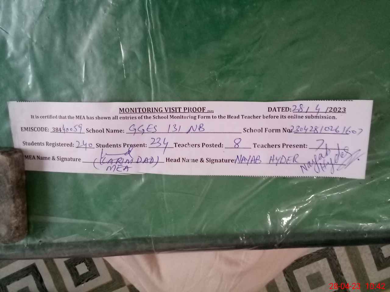 | Attendance Register | Head Teacher | MEA with School | Visit Proof |