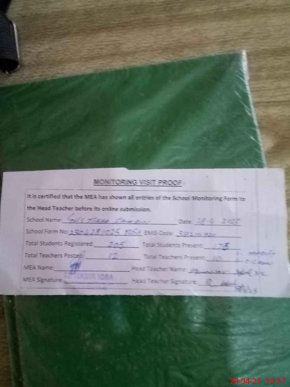 | Attendance Register | Head Teacher | MEA with School | Visit Proof |