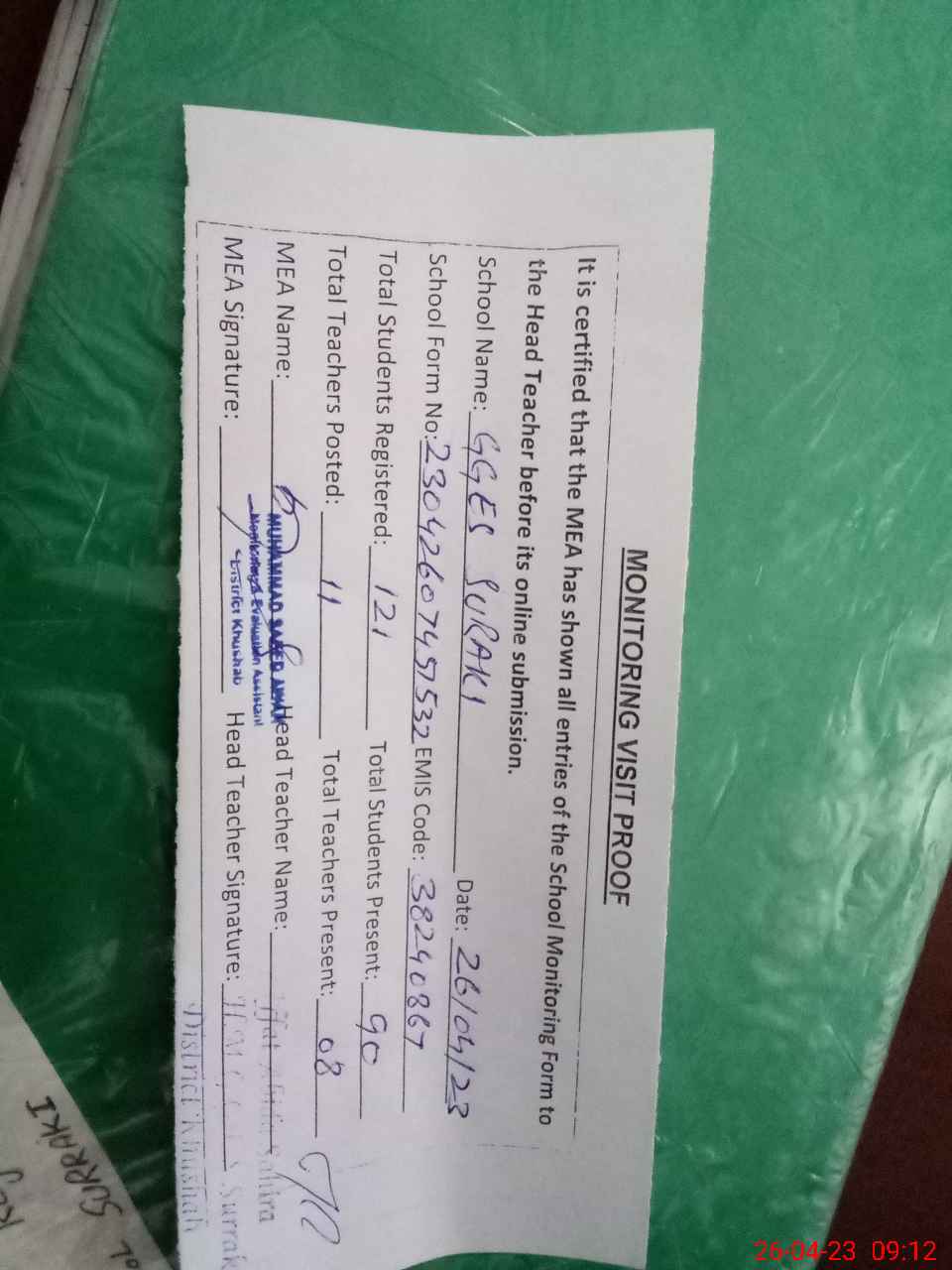 | Attendance Register | Head Teacher | MEA with School | Visit Proof |