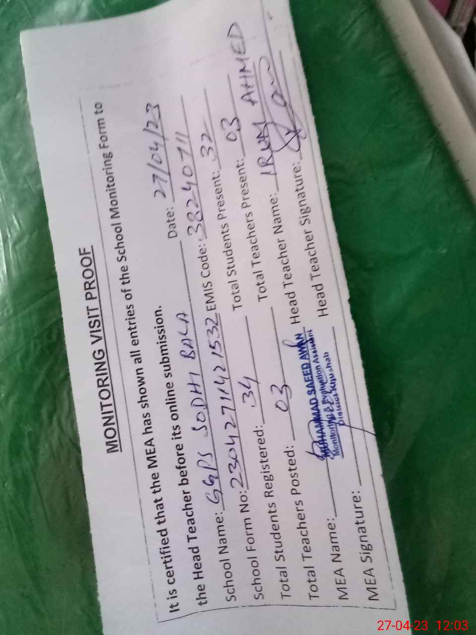| Attendance Register | Head Teacher | MEA with School | Visit Proof |