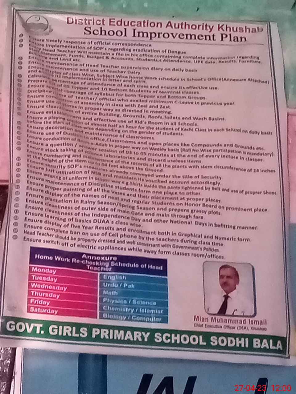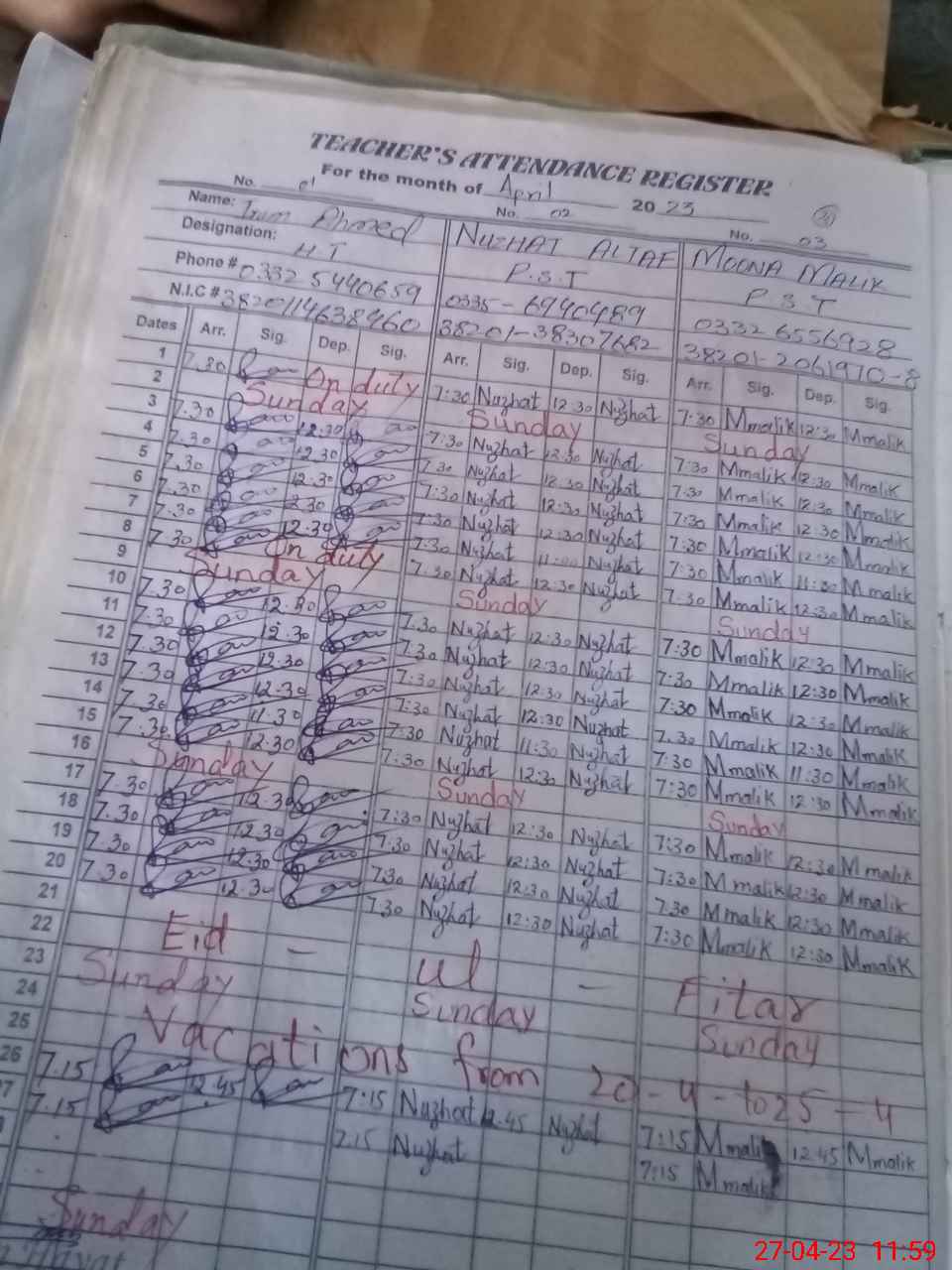 | Name: IR**** AH**** Designation: (School Headmaster's/Headmistress's) PST Phone/Cell Number: 03**** |