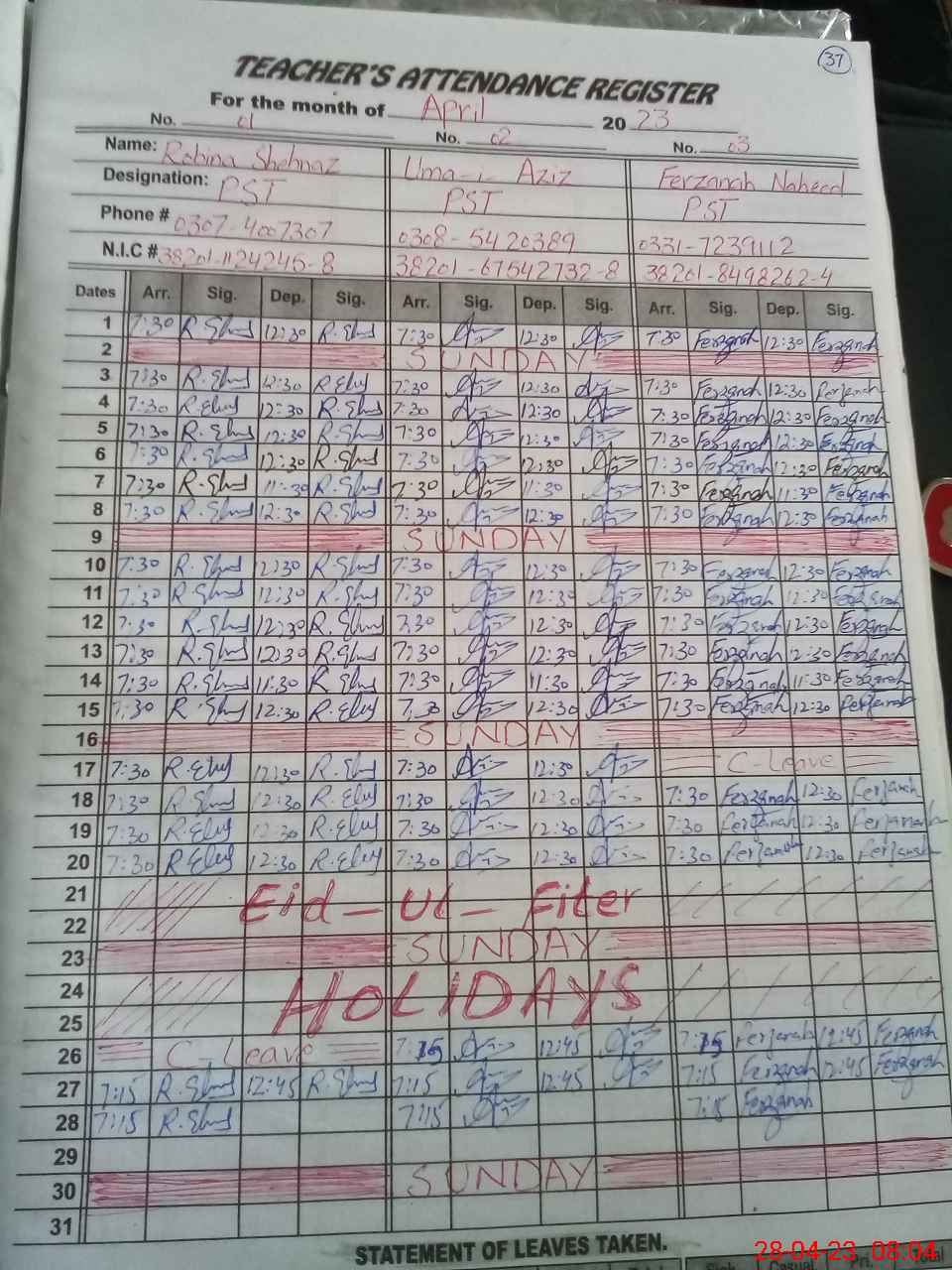 | CNIC | Full Name | Designation | R/C | Absence During Last Calender Month |