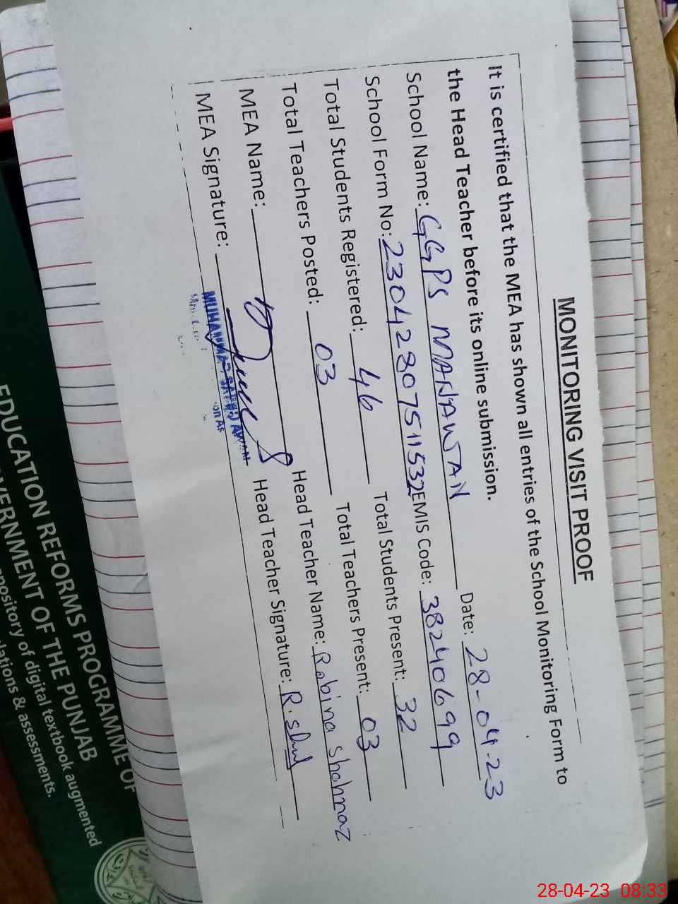 | Attendance Register | Head Teacher | MEA with School | Visit Proof |