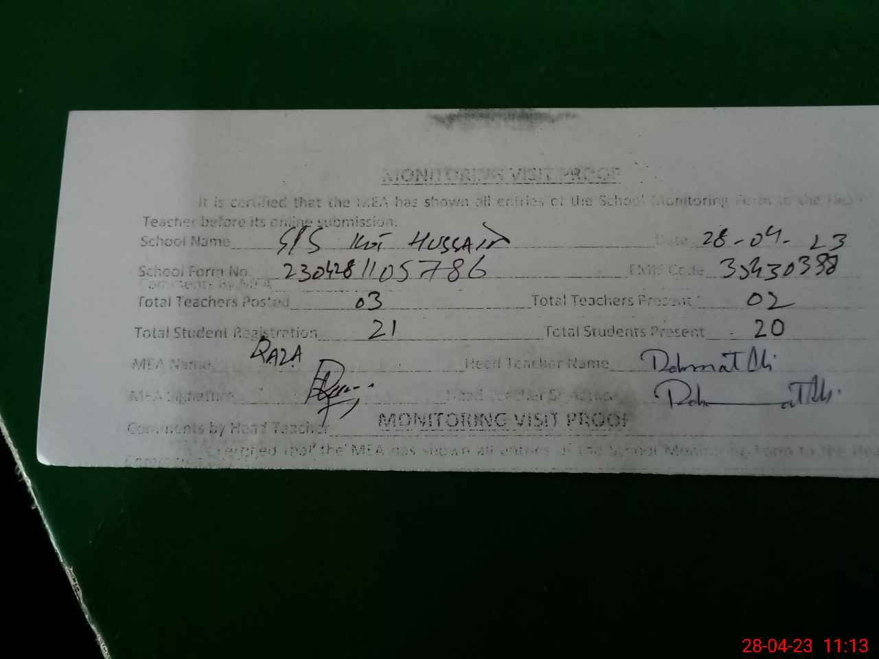 | Attendance Register | Head Teacher | MEA with School | Visit Proof |